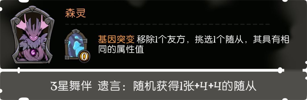 【森灵】在单机的月圆之夜当中,位于第四章,就有腐化周遭生物的能力,将其技能改成基因突变,反而更符合设定。经改造后的【森灵】与【基因改造】还是有稍许区别的,【基因改造】是可控的,可以指定变成某个等级的随从,而【森灵】的【基因突变】只能随机变成不同星级的随从,这即是限制强度也是增加风味的一种修改手段。