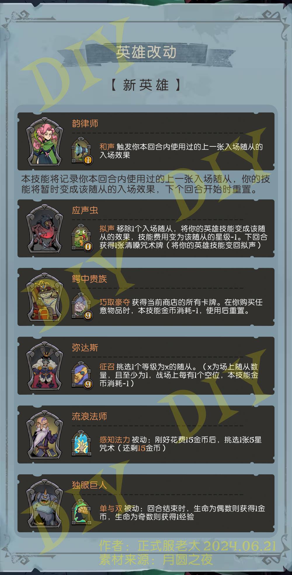 我对DIY设计难度的理解是这样的:新玩法(舞伴类)>新阵营(30张左右随从牌,两三个体系,数张灵活单卡)>新英雄>新随从(装备、咒术)。我错过了二三月份官方举办的英雄DIY活动,在设计完一些随从和阵营之后,我感到我对设计英雄还有一些想法,因此我改造了一些旧英雄,设计了一些新英雄。