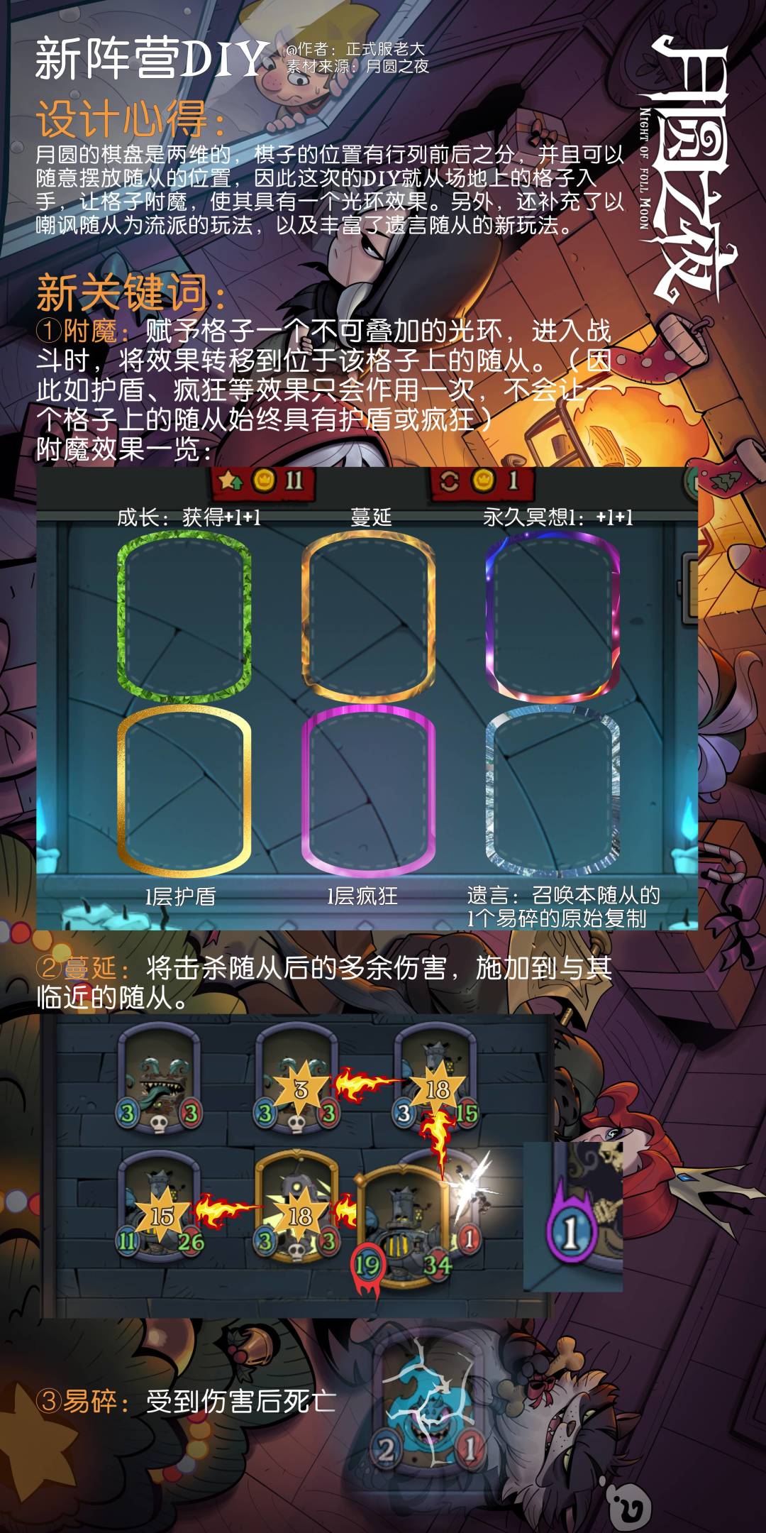 这是我为月圆之夜制作的第一个DIY作品,那时还没有镜中对决(PVP),也没有【狼人】和【巫师】阵营。整体DIY的强度和平衡都是基于我对单机模式的一些微弱理解,这个模式给我最大的感受是自由,因为操作时间不限,你可以随心所欲地构建你的阵容,因为没有其他玩家,不用担心某张卡超模或者太弱,所以我能把重心放在趣味性上。