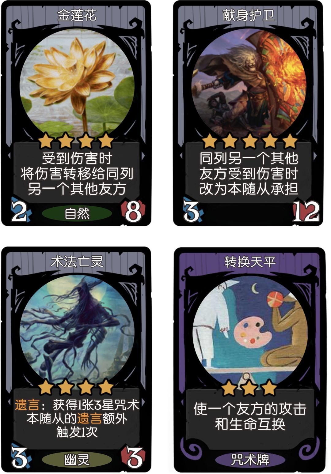 【献身护卫】反向的【金莲花】,不能同名互传,可作为对策卡保护核心随从。