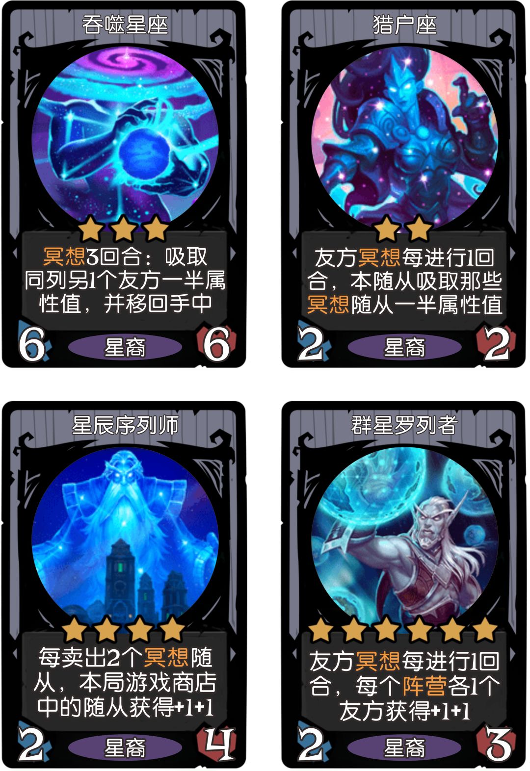 【群星罗列者】星裔阵营的一大特色是多阵营,除了贴膜爷爷带动的附着体系,【半人马】【养蝎人】【黄金狮子】【引星者】【星星射手】【幽冥星使】都展现了多阵营的特色,阵营越多收益越高。所以【群星罗列者】是这个体系的补强,上述的随从几乎都是过度随从,缺少一个多阵营体系的终端随从,贴膜爷爷的失势,更让这个体系雪上加霜,成为非主流体系。