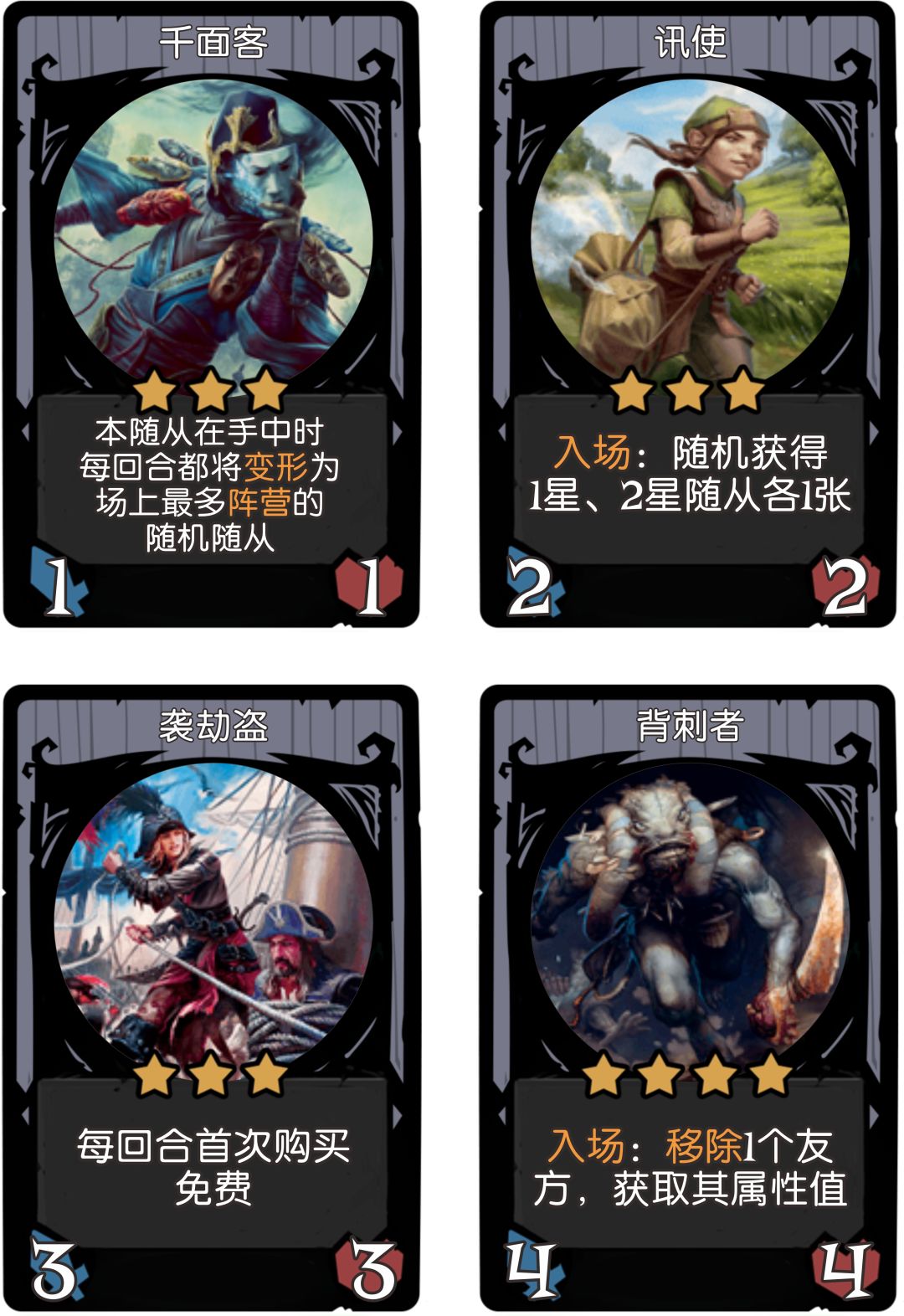 【千面客】曾经酒馆战棋有一张卡叫百变泽鲁斯,在手牌时可无视商店等级限制变化成任意随从。我在这个基础上,为镜中对决设计了相似的一张卡,首先变化的随从不能超过商店等级,这是出于平衡的考虑,其次变化的方向为友方阵营最多的随从,这是出于定向有用的考虑。