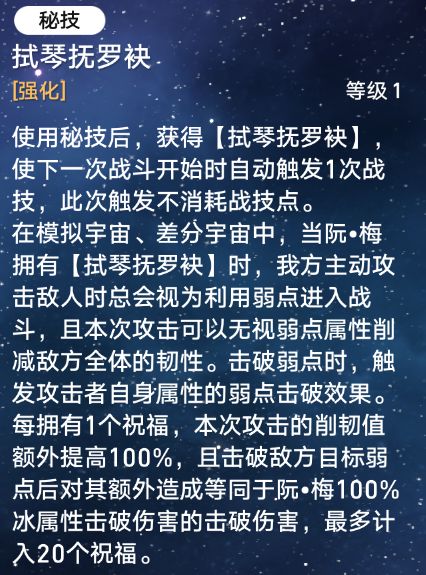阮·梅在这次的差分宇宙中可谓是大放异彩,不仅拥有着与版本热门队伍超击破队相适应的增益方向,战技也有着针对模拟宇宙而设计的超强效果。通过在模拟宇宙中获取的祝福个数来对目标进行大额削韧,基本到BOSS关卡的时候我们的祝福个数也积累了很多,一发战技下去视觉效果拉满,实战效果也拉满。