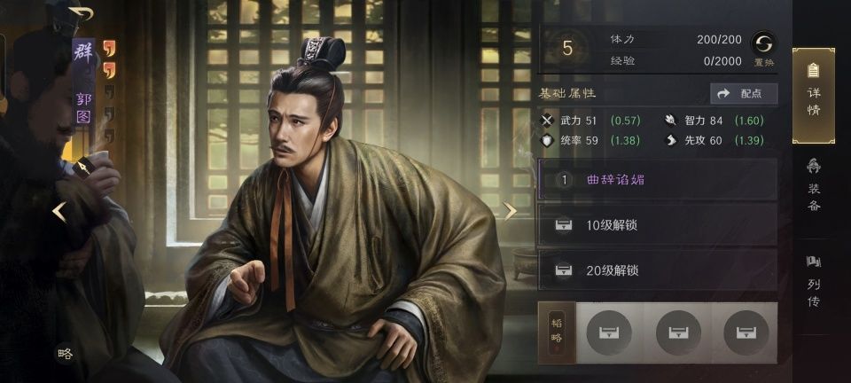 袁绍麾下的主要谋士,三国时期最著名的搅S棍之一。他在三国谋定天下的默认战法曲辞谄媚,是个100%发动的指挥技能。每个回合开始,都能让我方智力最高的武将大幅提升伤害值,回合结束的时候还能再次让我方智力最高的武将对敌进行加成的谋略伤害。唯一的副作用,就是也可能会令我方智力最高的人陷入混乱状态。刚开始只有5%的概率,随着回合数增多才会逐步提高。尽管这是个坑点,倒也不能完全否定他气氛组担当的价值。第七位:简雍。