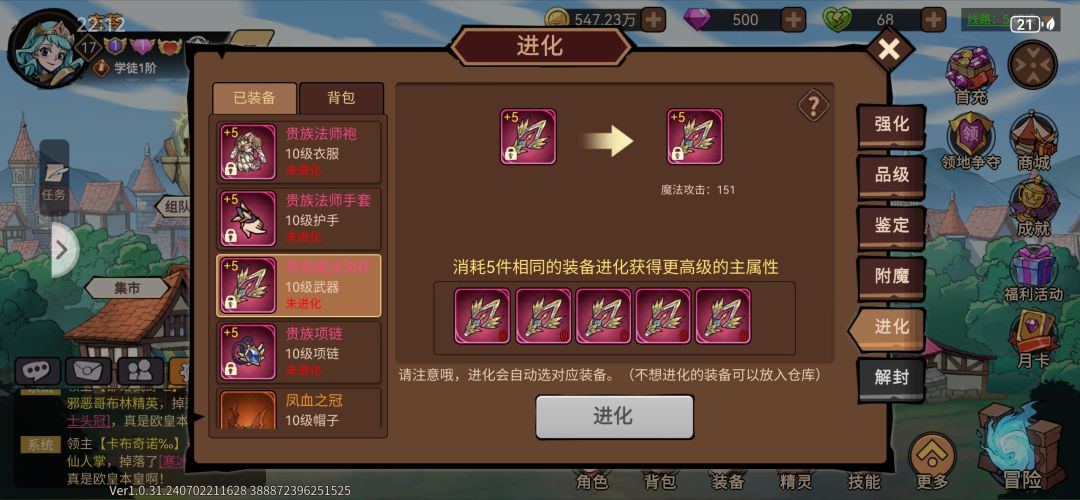 这时候这时候有人可能会问了,说这么多有什么用呢?每个角色只能装备一件武器啊。说的好!让我们来看图5,在装备里面是有进化这一项的,只要消耗5个同种装备,就可以获得属性上的提升,10级粉装武器进化后可以获得151点的攻击力,这在前期是相当高的数值了,同时10级粉装可以最多进化8次,平民玩家虽然无法获取到如此多的核心,但是进化个两三次还是足够的,这就为我们推图和刷深渊提供了重要的助力。
