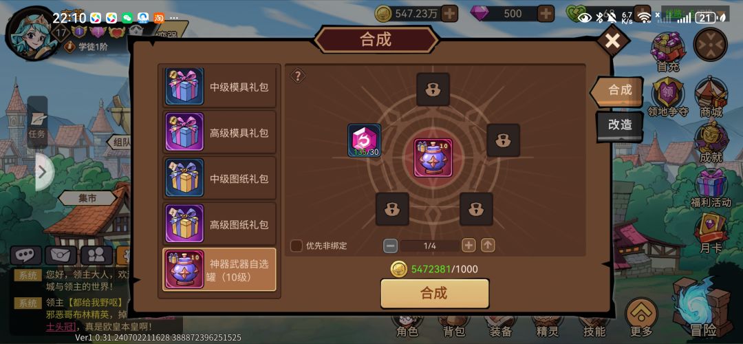 ),蚊子再小也是肉嘛。过完新手教程以后,大家把活动和成就的奖励领一下,等级应该至少也达到了10级,这个时候就到了最重要的一步,武器进化,新手攻略中有一步是让大家去制造所造一个10级武器罐子,这一点非常重要(具体位置见于图3图4)。让我们来仔细观察,正常的10级罐子是随机获得一件10级的贵族粉装,而且很大的概率是你不需要的装备,同时需要50个核心,而这个武器罐子是自选,而且只需要30个核心,同时分解贵族粉装可以固定得到10个核心,也就是说我们花20个核心就能获得一件10级粉色武器!!!