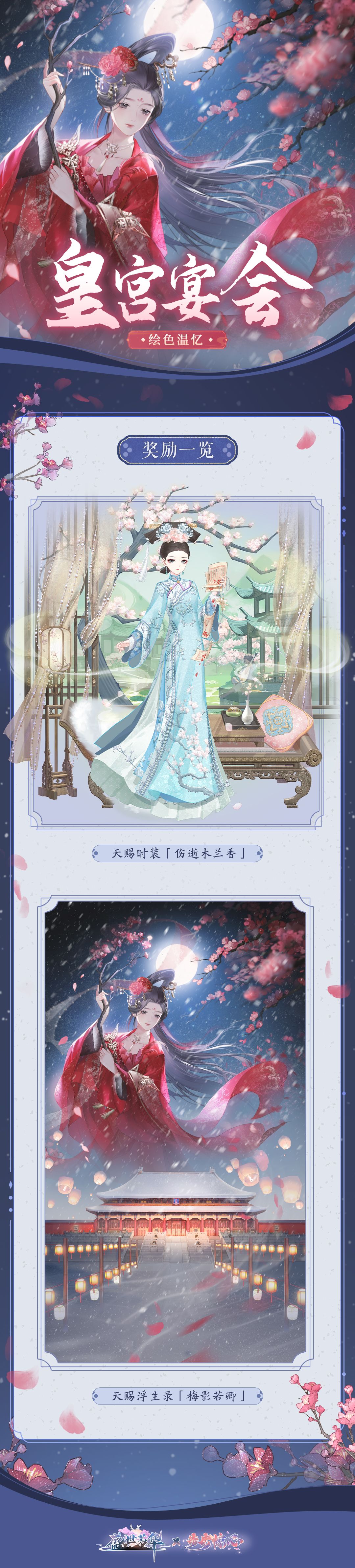 a.回忆碎片可于[皇宫宴会-绘色温忆]中解锁对应模块,解锁全部模块即可获得联动限定天赐时装【伤逝木兰香】、联动限定天赐圆梦浮生录【梅影若卿】。