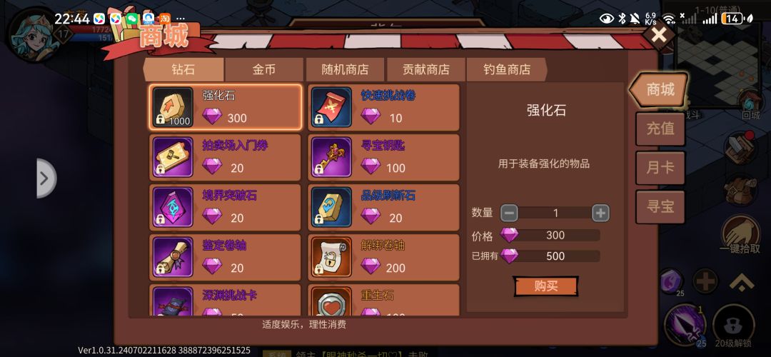如如果你打关卡打boss的时候,发现自己买的药或者复活石,不够用了,也不用慌,虽然关卡里没有商店可以让我们购买,但我们可以通过别的途径来前往商店(具体见图5,图6),我们可以打开背包,找一个物品点开,它会有一个获取途径,我们要做的就是找到一个获取途径是商城的物品,然后点击商城就可以前往商城,这样就不用担心关卡中我们药品不够用而导致前功尽弃。同样的,这个方法也可以卡到其他奇奇怪怪的界面上去(应该不是bug,大概吧)。