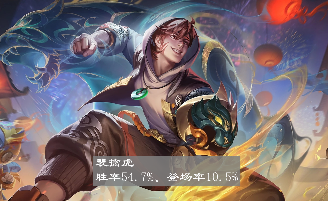 打野最大的惊喜当属裴擒虎,胜率54.7%、登场率10.5%,综合数据排在打野英雄中的第一。