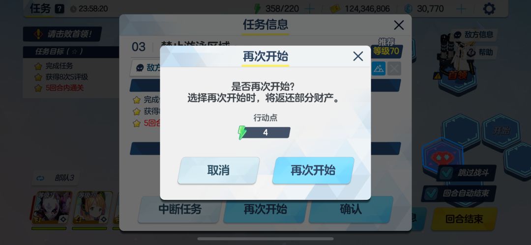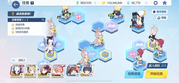 如图2,左边随意配队,回合1往左上走一格开路就行,右边配你的主力,把穿泳装的杂🐟清完如图3,然后就可以点再次开始了。每轮花1体可以刷20多个任务怪,最后一轮左边队伍往下走开boss的路,打掉boss结束。