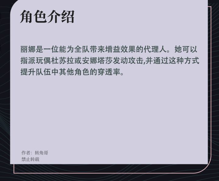 丽娜是一位能为全队带来增益效果的代理人。她可以指派玩偶杜苏拉或安娜塔莎发动攻击,并通过这种方式提升队伍中其他角色的穿透率。穿透率加成作为防御乘区的增益,数值类型相当高贵,并且不挑流派,目前所有伤害来源均能吃到穿透方面的收益。除此之外,丽娜还能与感电队搭配,为其提供额外的属性增益,是一位既拥有专属体系,又拥有超强泛用性的优质辅助。