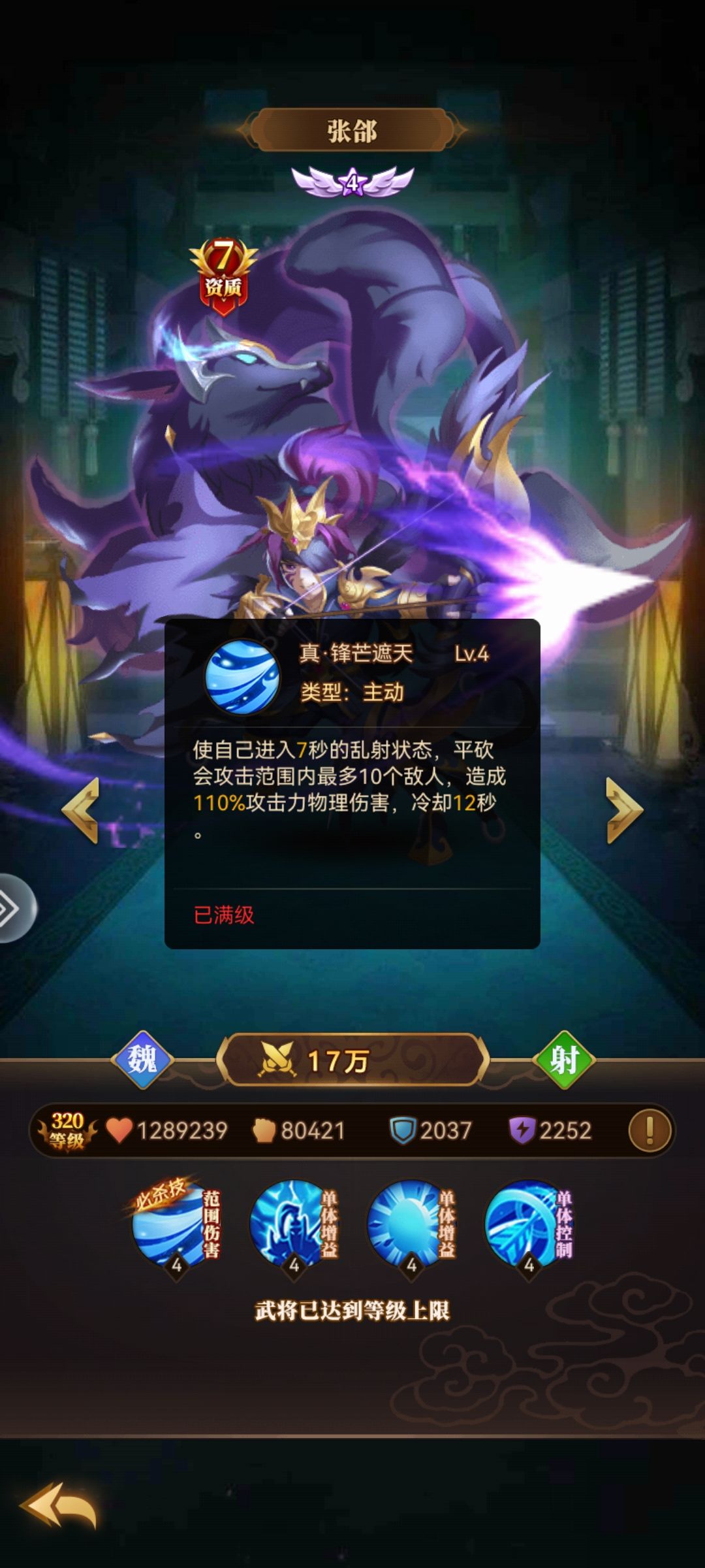 真·锋芒遮天(Lv.4):张郃的主动技能让他能够在7秒内进入乱射状态,平砍会攻击范围内最多10个敌人,造成110%攻击力的物理伤害。这一技能让张郃成为了战场上的清场高手,无论是面对密集的敌人还是分散的目标,他都能以箭雨般的攻势将其一一击溃。