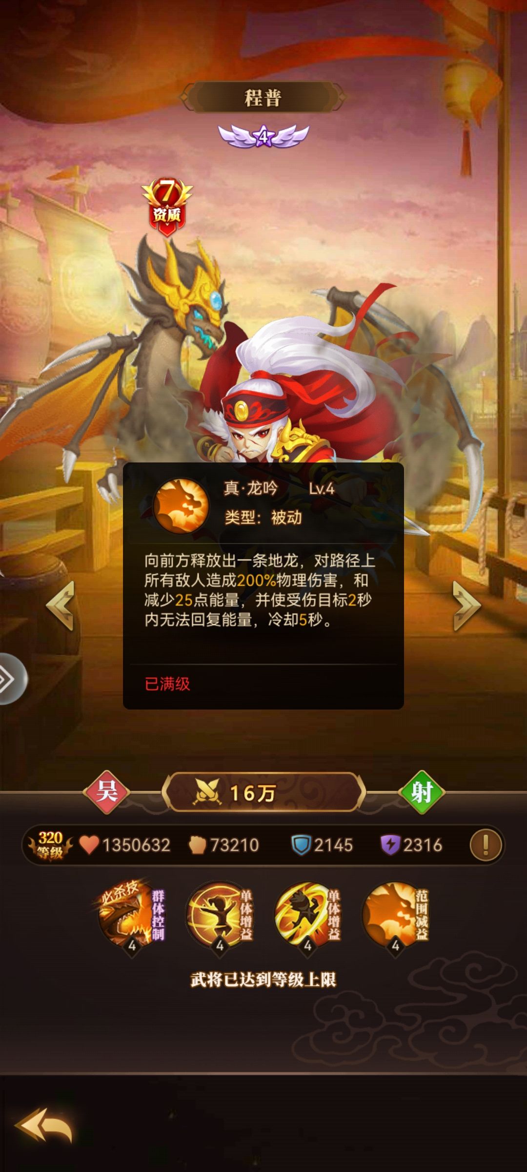 真·地龙(Lv.4):程普的主动技能让他在战场上能够召唤出地龙对敌人进行打击。在最高攻击力的4个敌方脚下召唤地龙破土而出,造成275%的法术伤害并使其昏迷2秒。这一技能不仅让程普拥有了强大的控制能力,还能在团战中有效地限制敌人的行动,为队友创造输出机会。![[TapFamily_阴暗爬行]](https://img.tapimg.com/market/images/00a867e7d6aa958873465116fcd7b0de.gif)