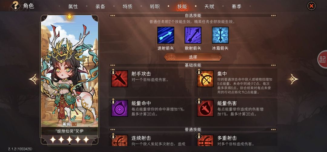 技能:局内散射箭矢的加1攻击目标但减伤的金词条我一直没拿,感觉很费;冰霜箭矢的15能量以上翻倍的词条不错,毕竟普攻小鹿不消耗能量
