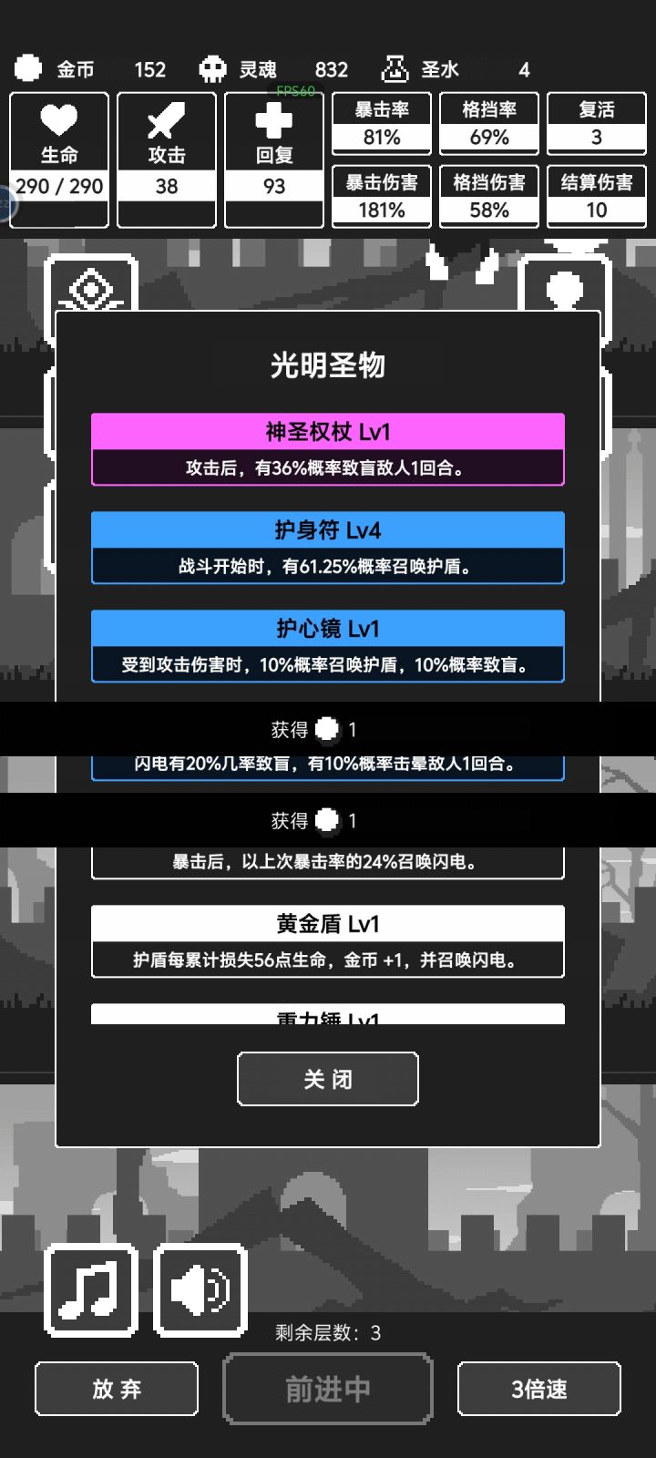 12关打法,很多人小怪就死了,优先护盾,神圣权杖,护心镜 前期,然后格挡,有暴击率先买暴击率,必须去狼人那买加暴击率回血的,还有致盲回血的得自己用圣水解锁,闪电就别买了 前期抗不住 需要的太多了,白色那也买个回血的属性