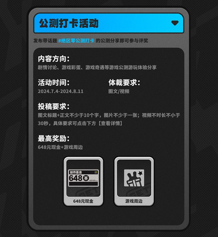 2.活动结束后,【公测打卡活动】获奖名单将在20个工作日内在本条动态公布,其余活动均在对应传送门活动帖内公布,请注意查看;