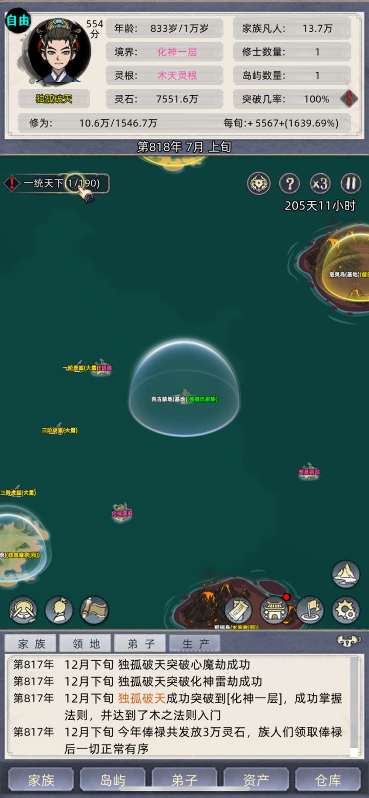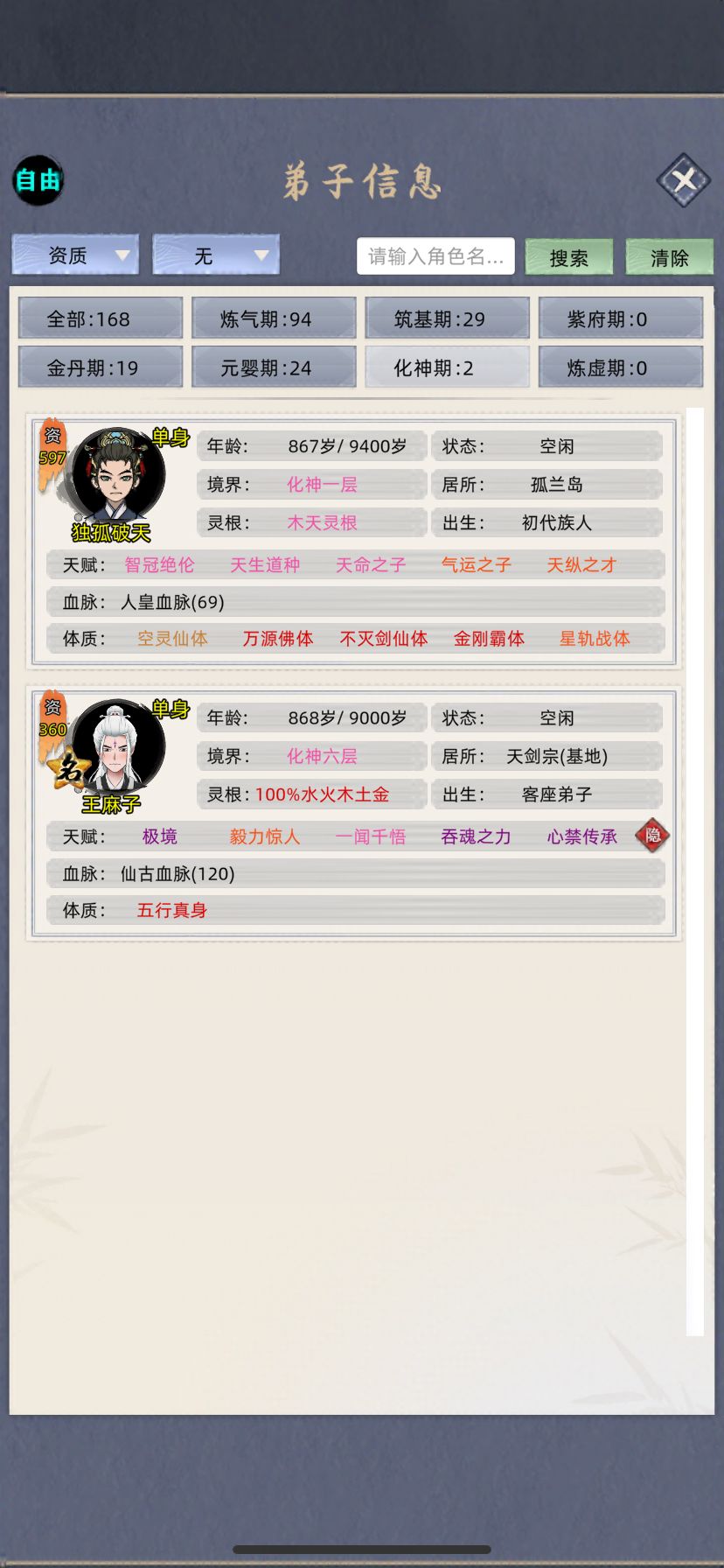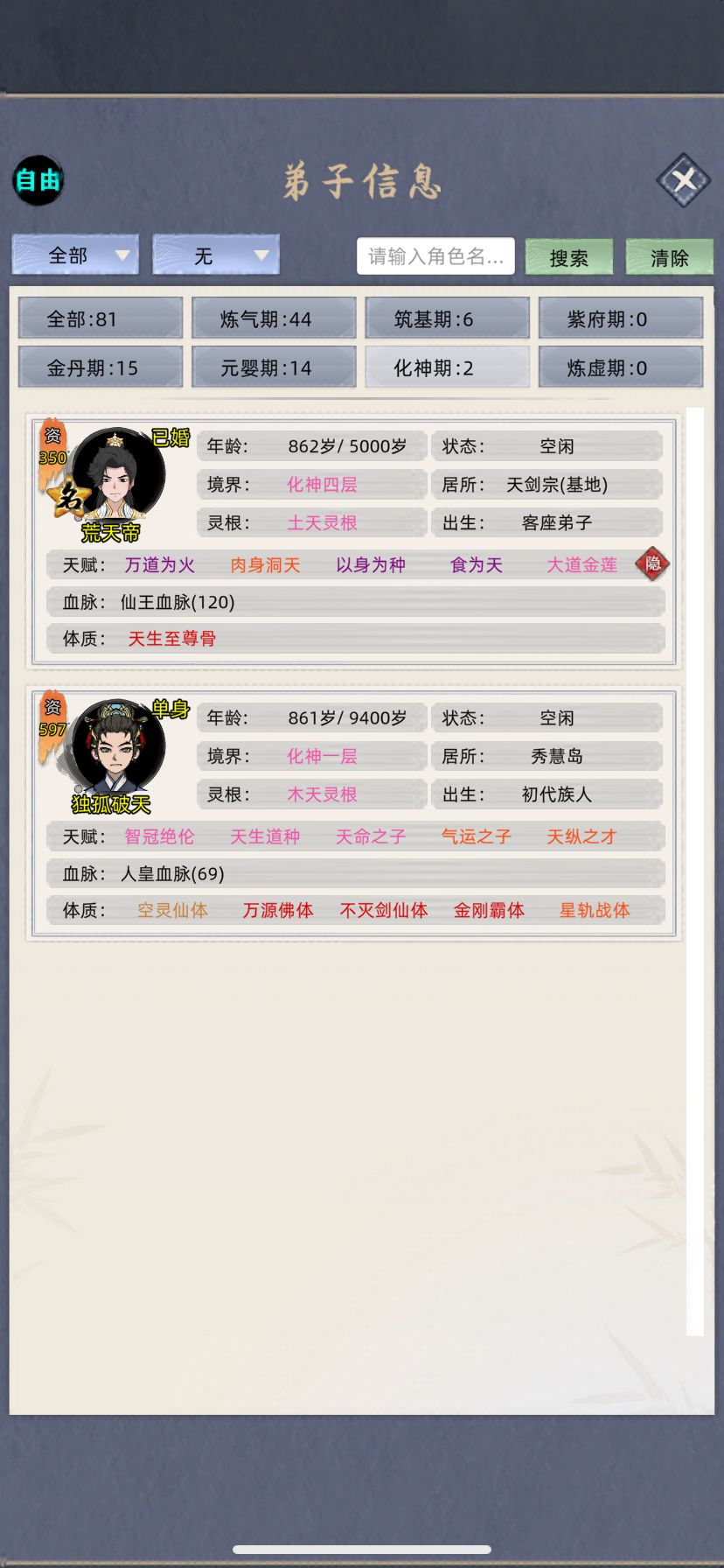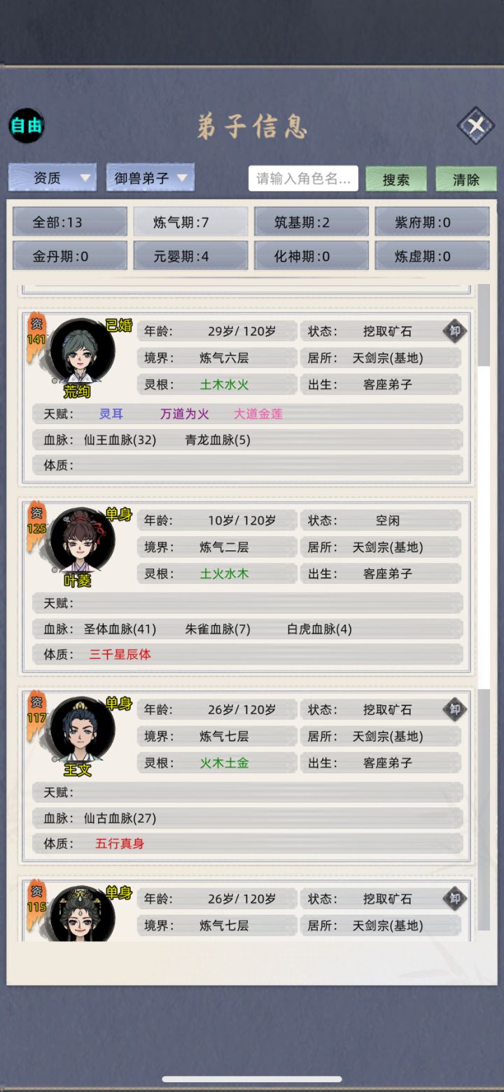 跟群里的几个小伙伴一起挑战玩554分的档,一开始主养老祖,快速到化神,(大概两三个小时,反正我是放着看了一部电影就化神了)然后去抓名人提体质天赋,配三真灵血脉➕名人天赋体质,结果发现这个遗传概率低的发指,SL了几个小时,想遗传个粉天赋遗传不了,体验太差,不玩了,换档