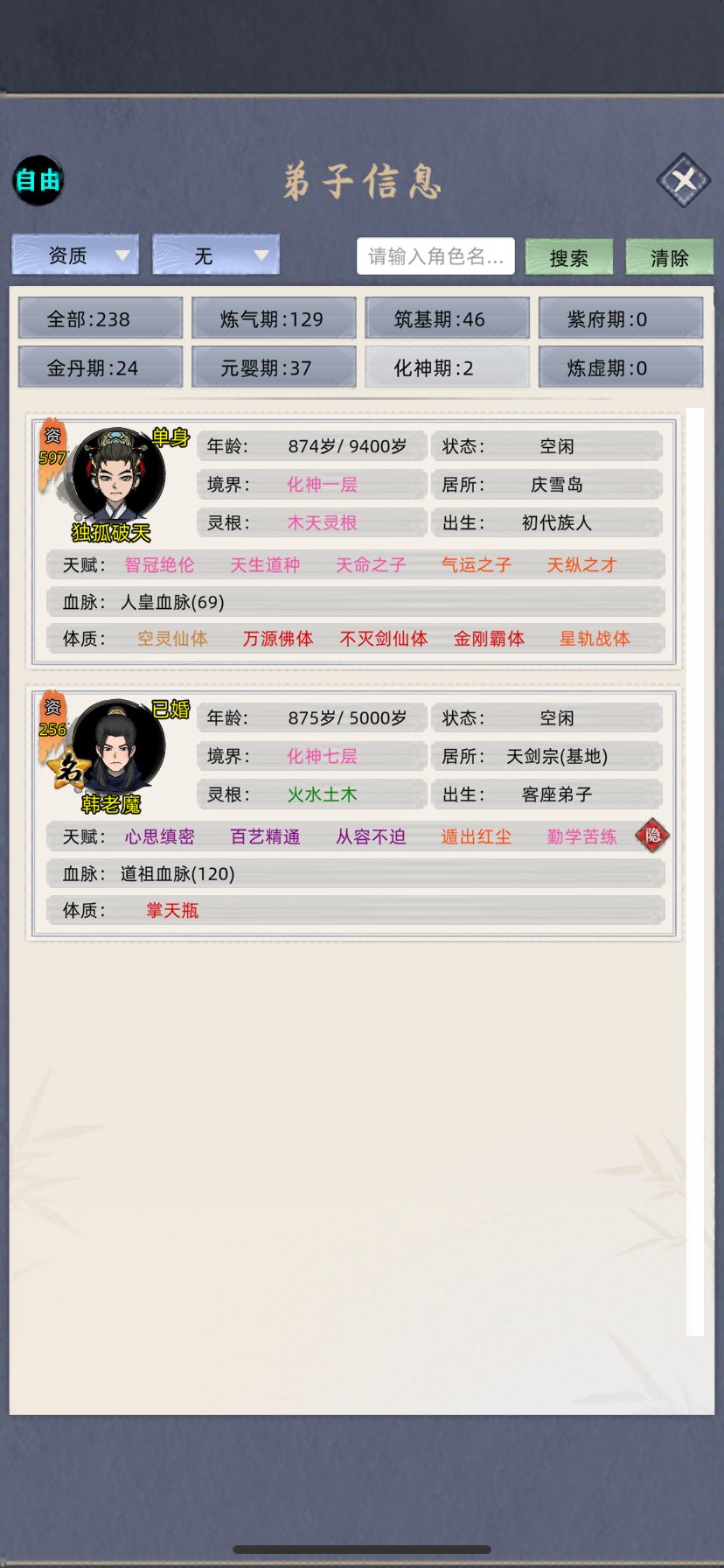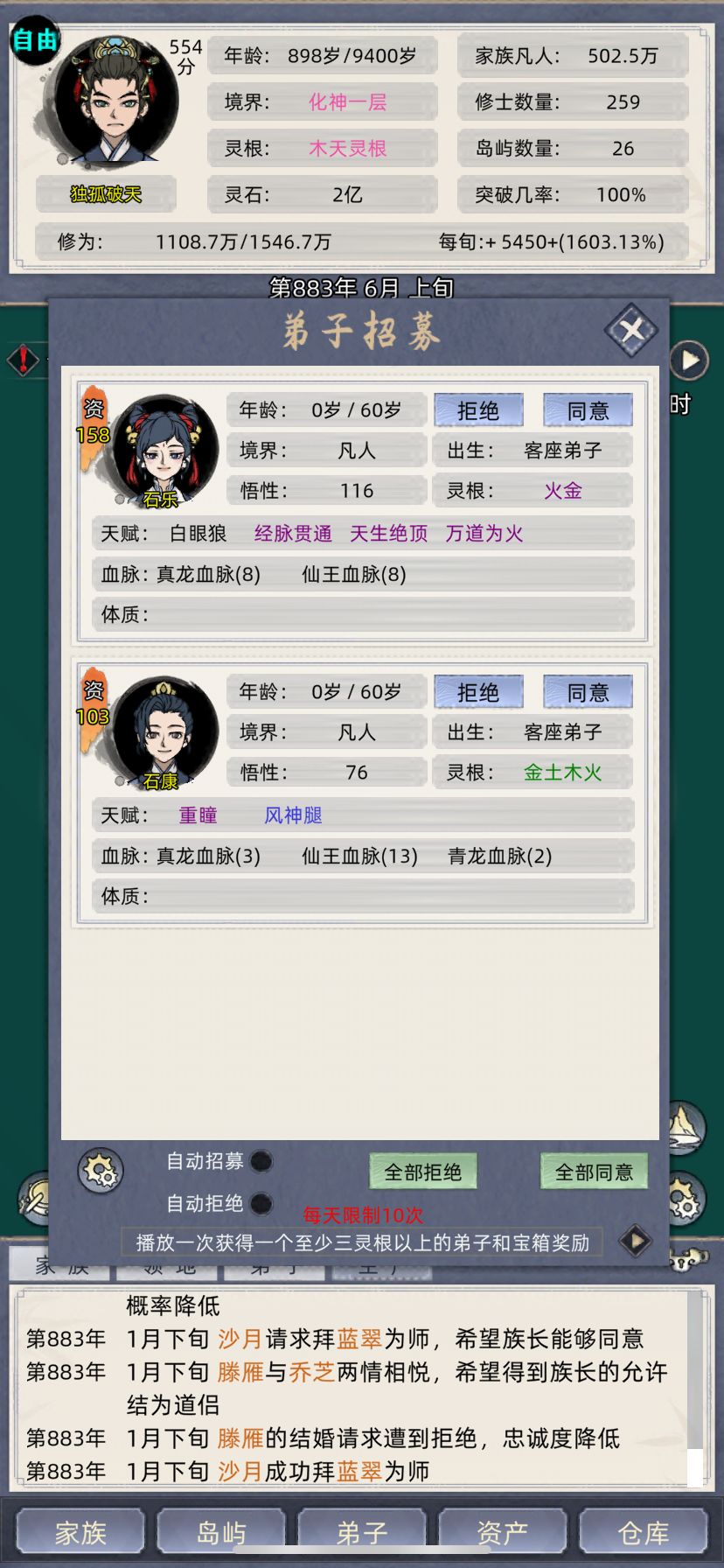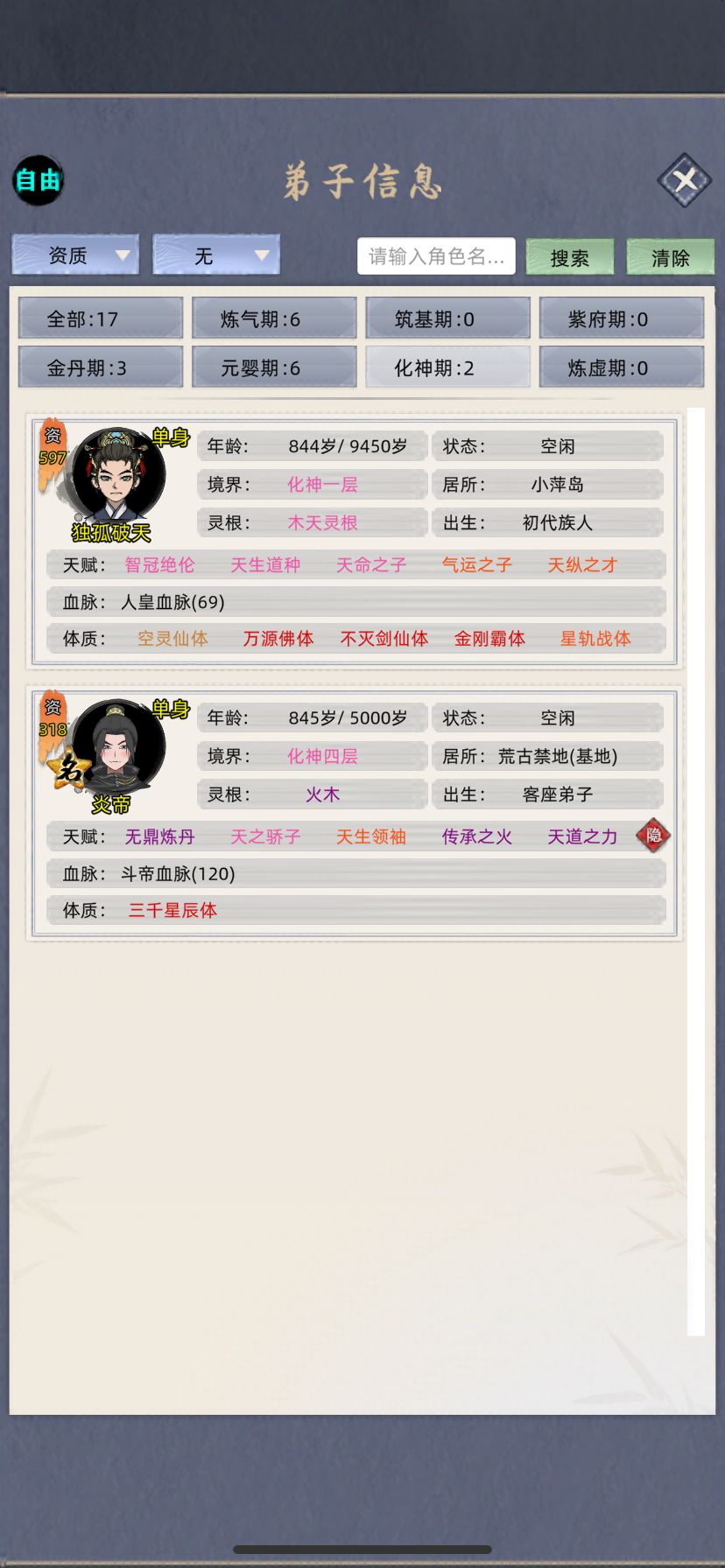 跟群里的几个小伙伴一起挑战玩554分的档,一开始主养老祖,快速到化神,(大概两三个小时,反正我是放着看了一部电影就化神了)然后去抓名人提体质天赋,配三真灵血脉➕名人天赋体质,结果发现这个遗传概率低的发指,SL了几个小时,想遗传个粉天赋遗传不了,体验太差,不玩了,换档