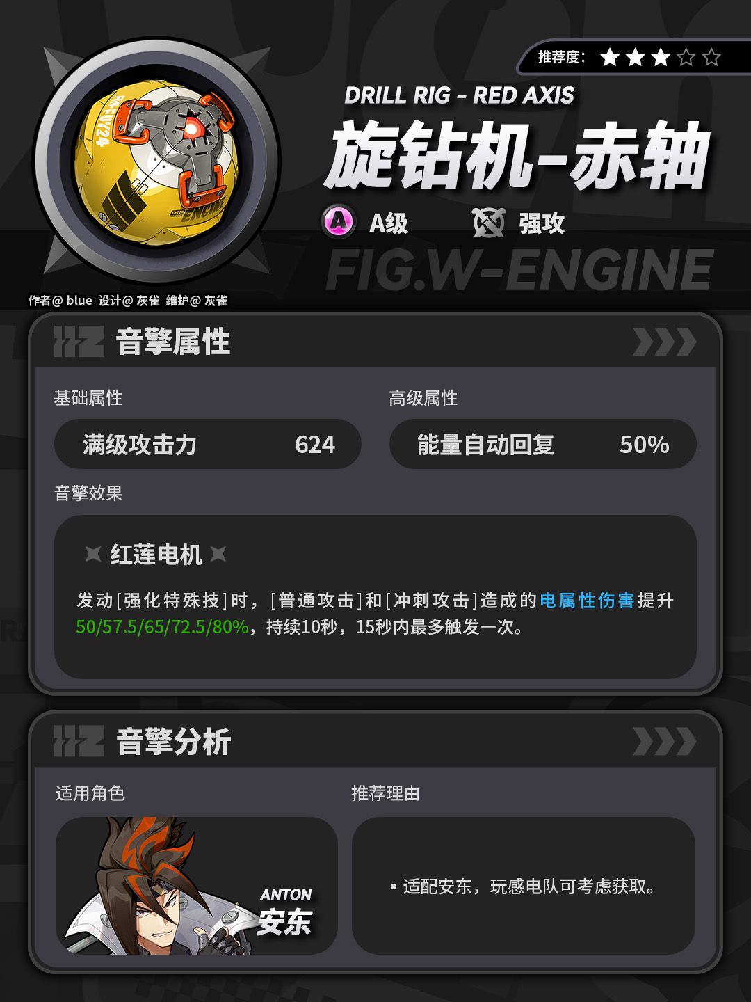 旋钻机-赤轴是安东的专武,在精5时能够提供高达80%的电属性伤害加成,且触发条件也与安东机制自洽。