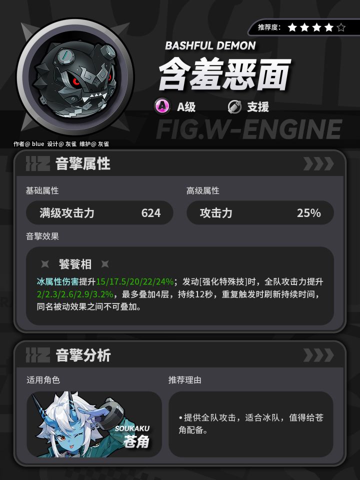 含羞恶面是苍角的专武,且能够为全队提供攻击力加成。