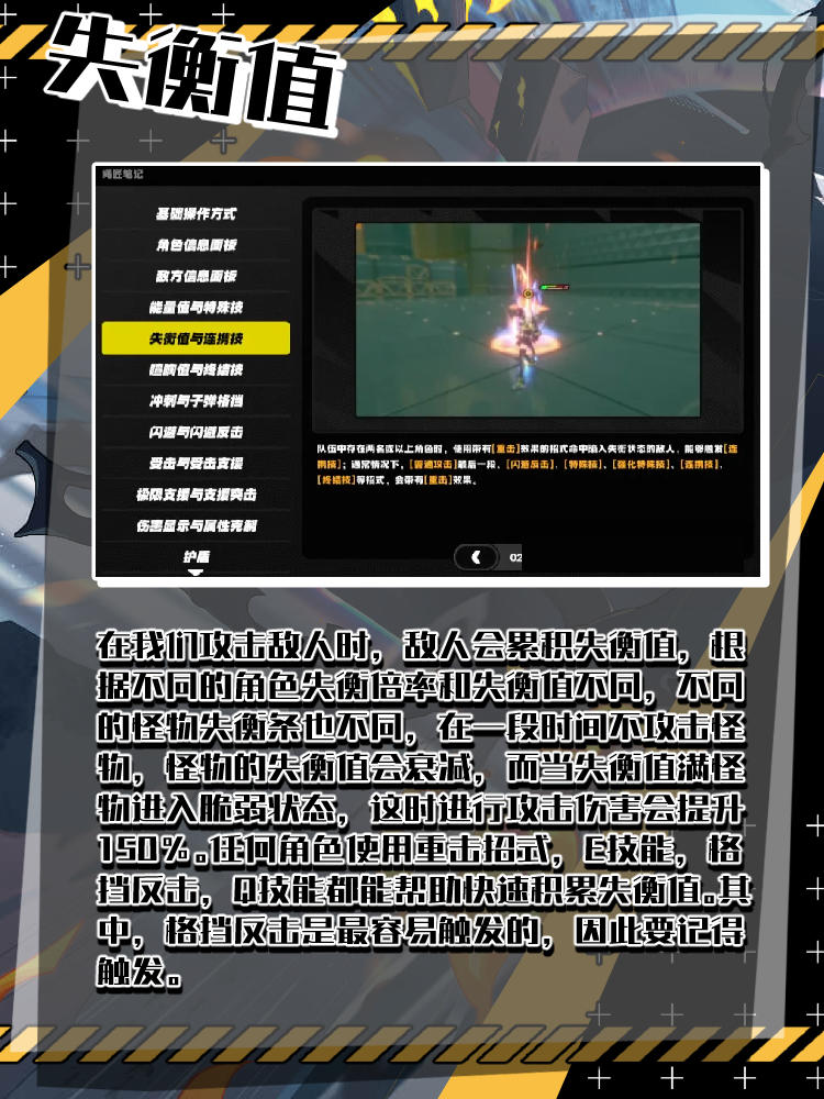 在我们攻击敌人时,敌人会累积失衡值,根据不同的角色失衡倍率和失衡值不同,不同的怪物失衡条也不同,在一段时间不攻击怪物,怪物的失衡值会衰减,而当失衡值满怪物进入脆弱状态,这时进行攻击伤害会提升150%。任何角色使用重击招式,E技能,格挡反击,Q技能都能帮助快速积累失衡值。其中,格挡反击是最容易触发的,因此要记得触发。