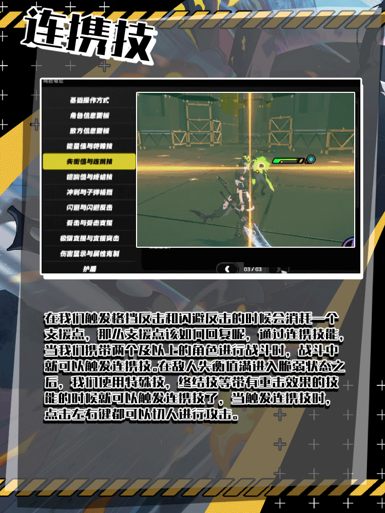 在我们触发格挡反击和闪避反击的时候会消耗一个支援点,那么支援点该如何回复呢,通过连携技能,当我们携带两个及以上的角色进行战斗时,战斗中就可以触发连携技。在敌人失衡值满进入脆弱状态之后,我们使用特殊技,终结技等带有重击效果的技能的时候就可以触发连携技了,当触发连携技时,点击左右键都可以切人进行攻击。