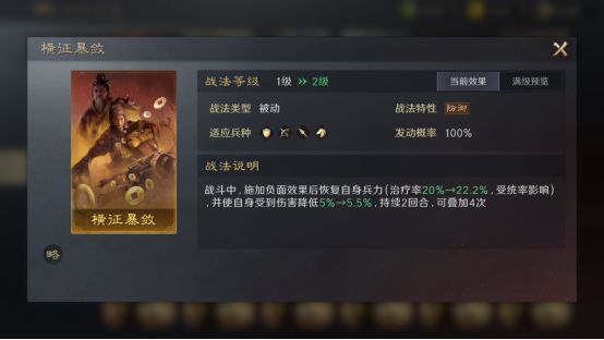 效果:战斗中,施加负面效果后恢复自身兵力(治疗率20%→40%,受统率影响)并使自身受到伤害降低5%→10%,持续2回合,可叠加4次(一个横征暴敛让多少治疗和辅助成为了身板梆硬的坦克,压缩队伍的格子腾出位置来让更多控场、副C来增加队伍的完整性。防御战法或许横征暴敛不是最硬的,但它一定是最具战略意义的。)