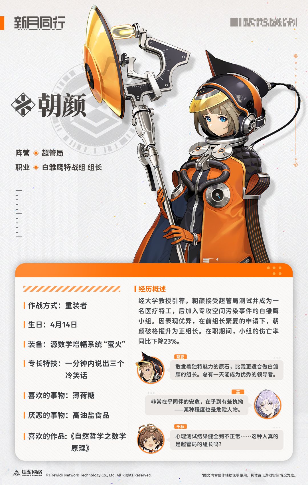 因表现优异,在前组长繁夏的申请下,朝颜破格擢升为正组长。在职期间,小组的伤亡率同比下降23%。