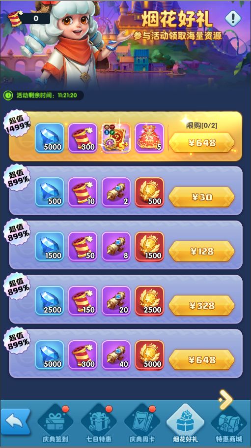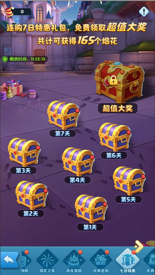 连续7日购买特惠礼包,即可免费领取超值大奖,获取更多烟花在烟花之夜燃放,可获得海量资源!