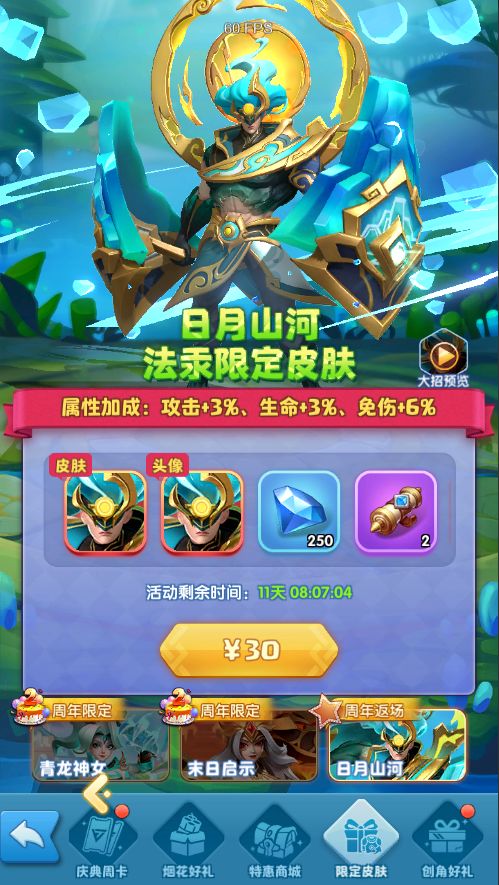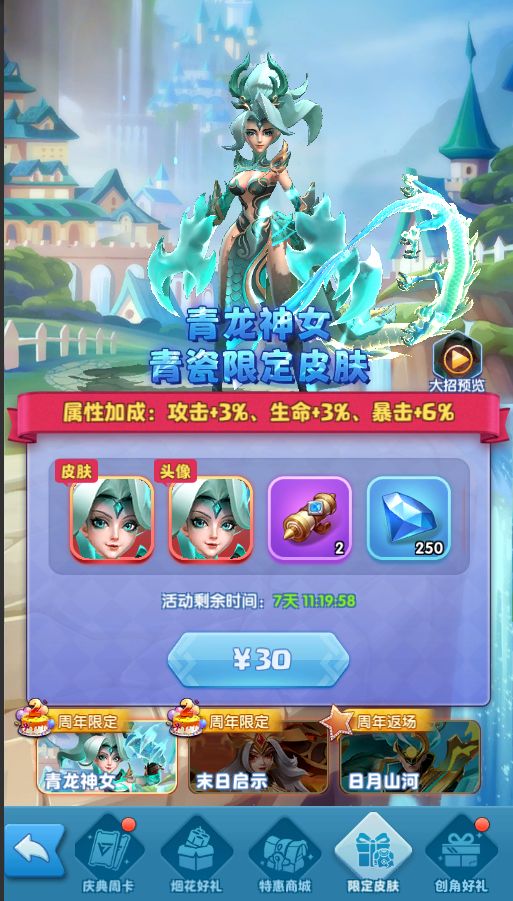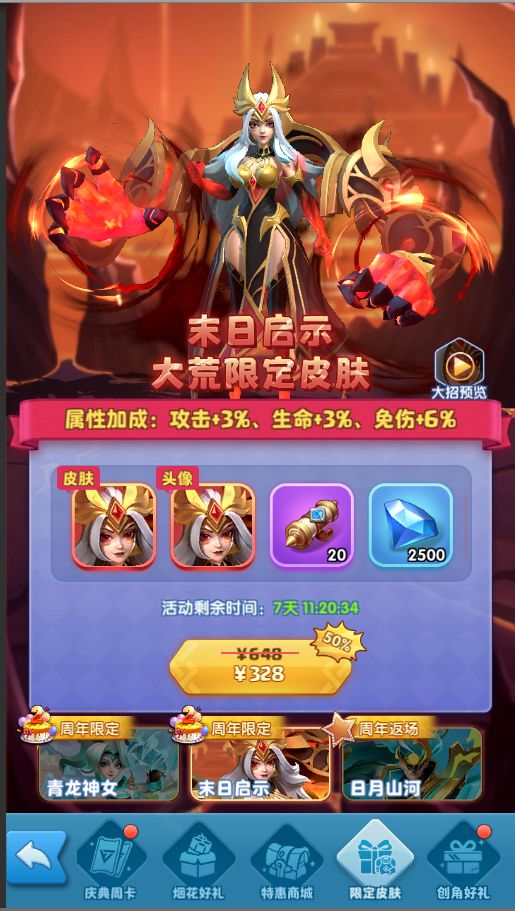 活动期间,出售周年限定皮肤大荒蛮神—末日启示、青瓷—青龙神女;