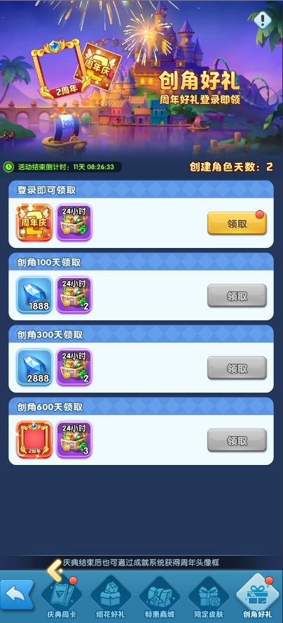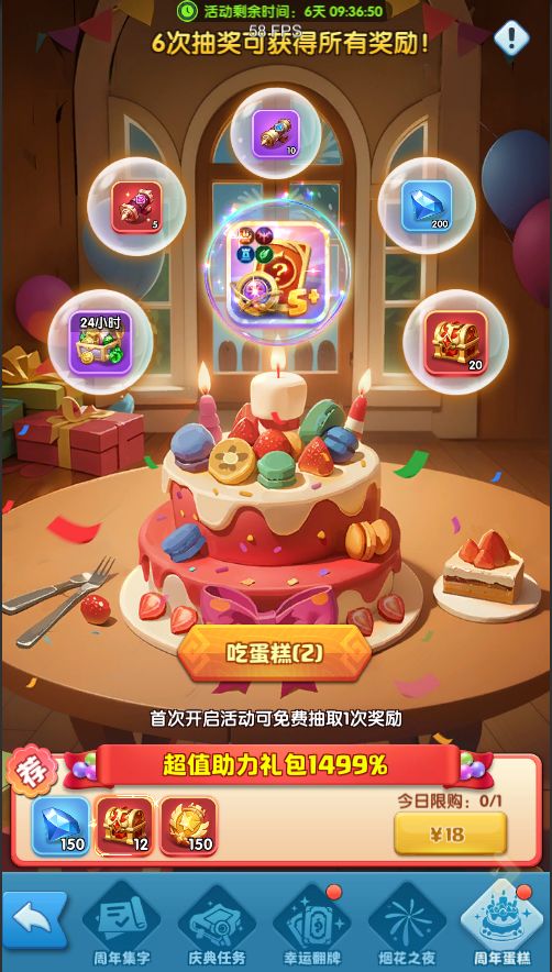 派对时间到,一起吃蛋糕!2周年,吃蛋糕,快乐庆生抽好礼!活动期间,每日充值满30元可参与【吃蛋糕】抽奖1次,共计6次可获得所有奖励!