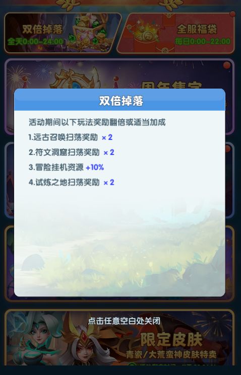 活动期间,旅行者可享受远古召唤、符文洞窟、试炼之地副本扫荡奖励翻倍,挂机资源增加的特权!