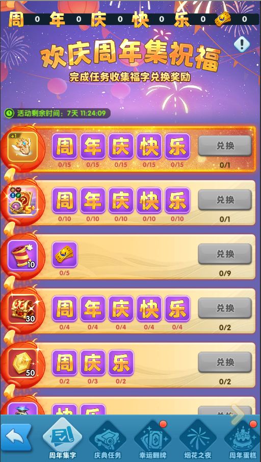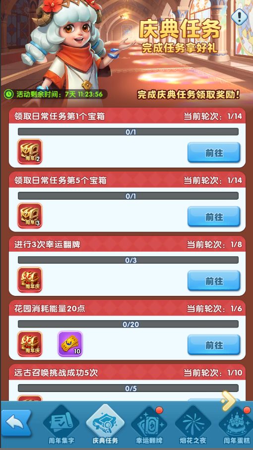活动期间,完成任务可获得宝箱、烟花兑换券,可用于周年集字中兑换奖励哦!