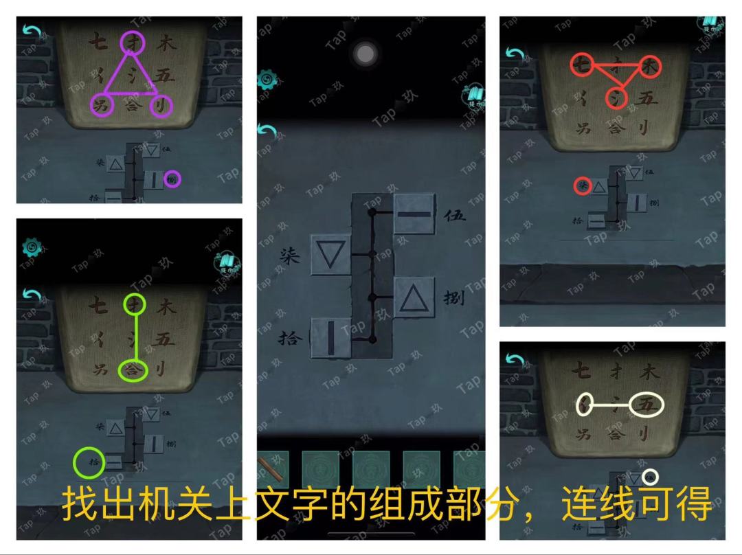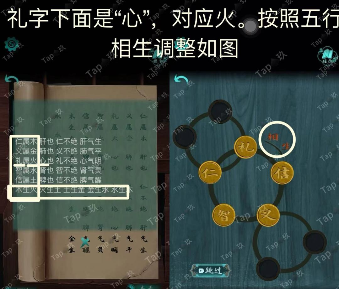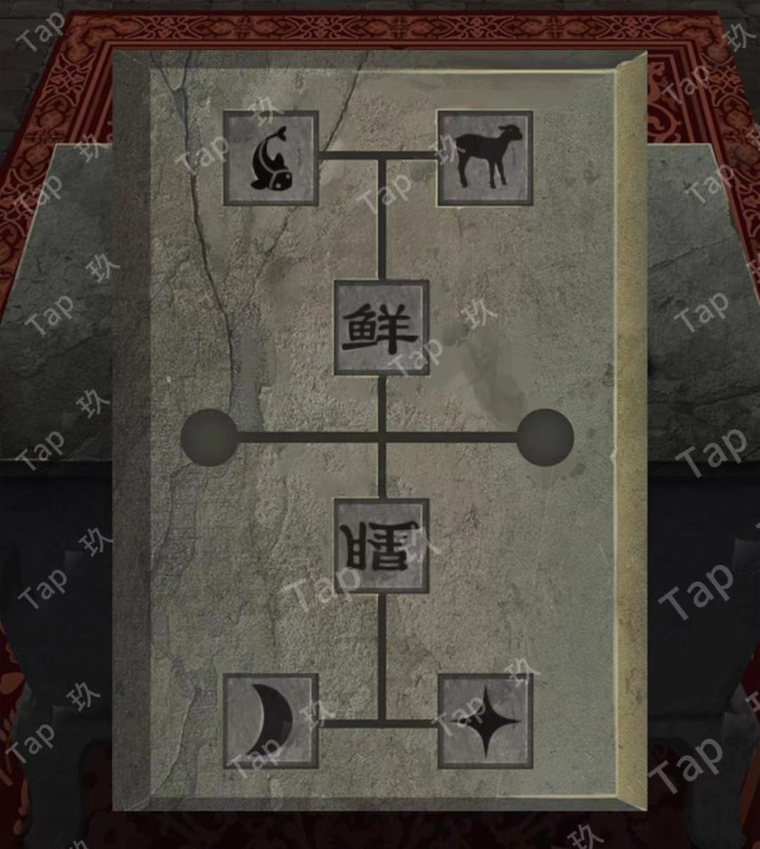 27-点击石桌机关,根据石板凹槽里的“鲜”得知上下按鲜腥分类,图案代表文字组成鲜腥二字。调整如图获得【白磷瓶】