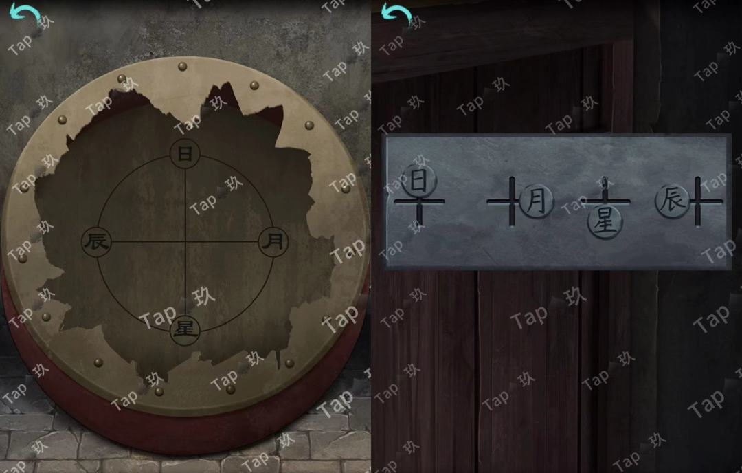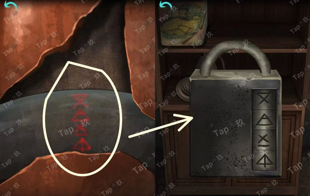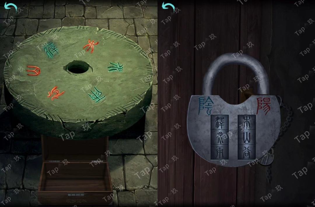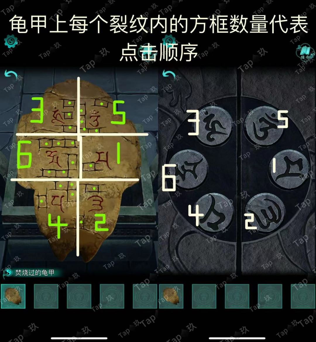 点击石像后的石门,结合【焚烧过的龟甲】点击如图,进入