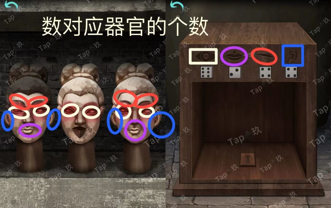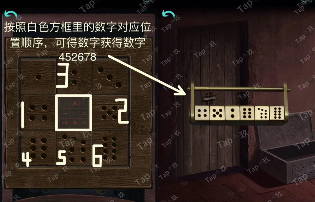 点击水缸旁的木箱子,放置【骰子】,结合木偶线索调整如图,获得【滑块1】