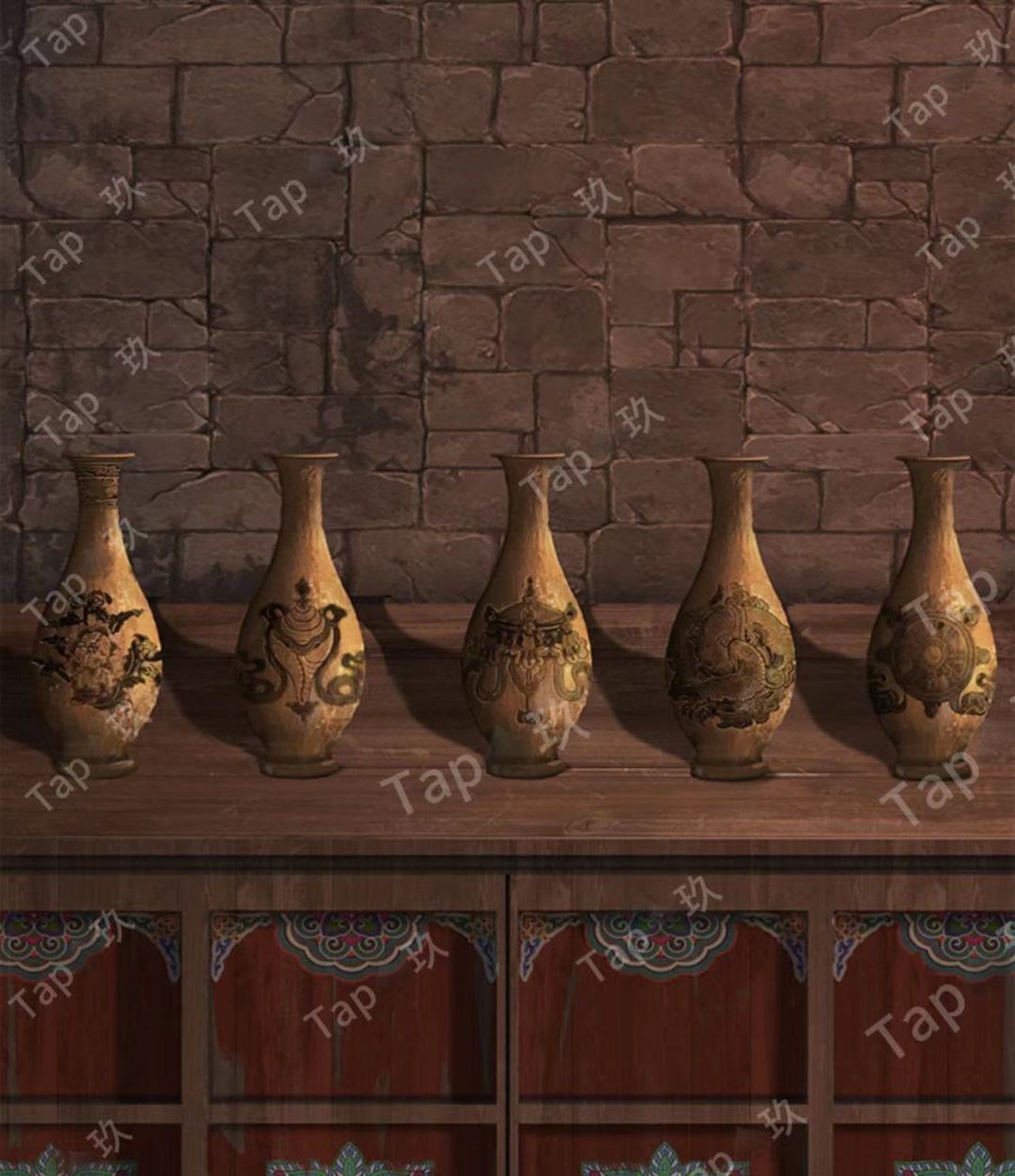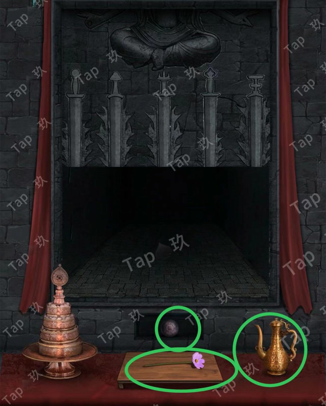 25-点击左侧佛龛,放置【禅音花】【青稞酒】【摩尼宝珠】,密道打开了进入