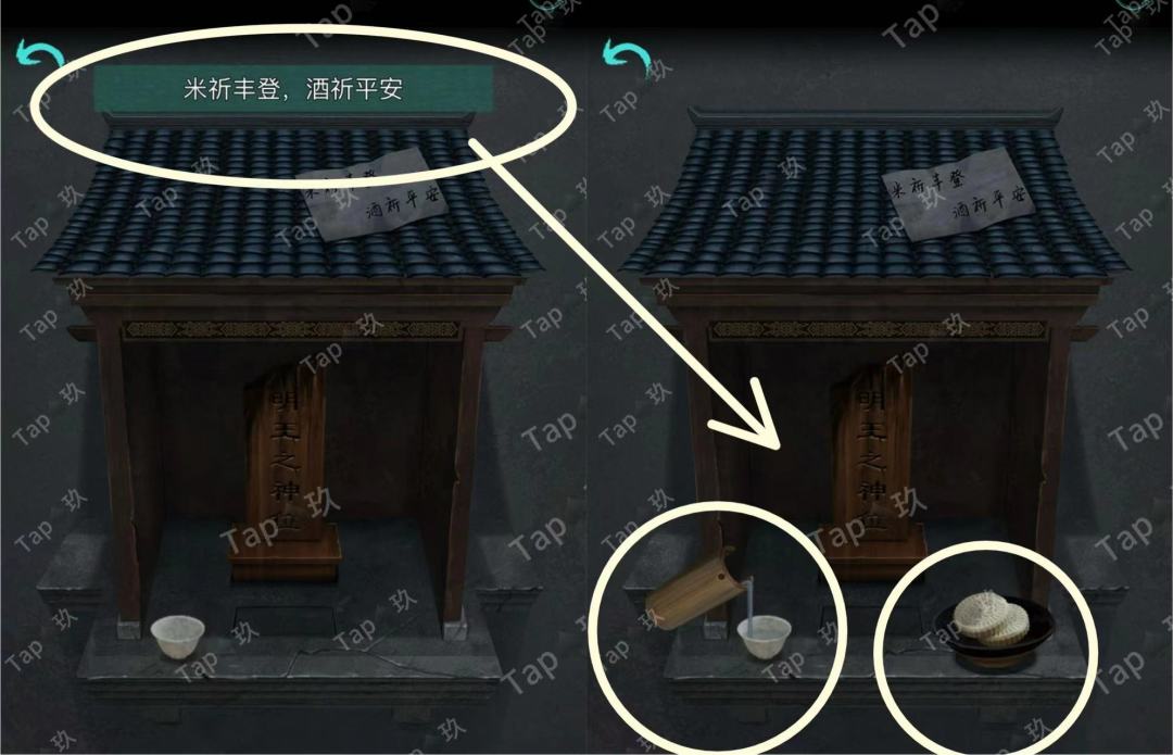 12-点击院中梯子左侧墙壁上的祭坛,使用【米饼】【装满酒的酒提】,获得【保险丝】