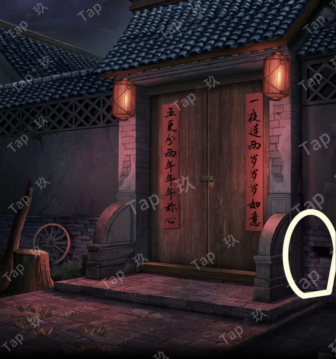 3-点击院子中石磨盘下的木箱子,结合大门上的对联调整如图,获得【剪线钳】