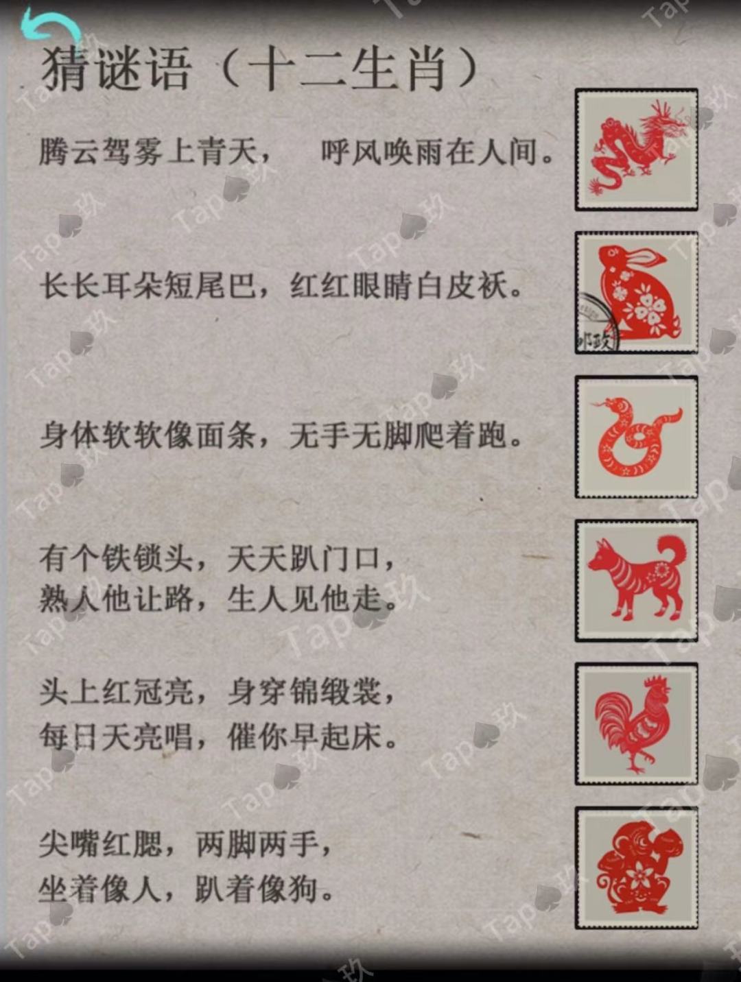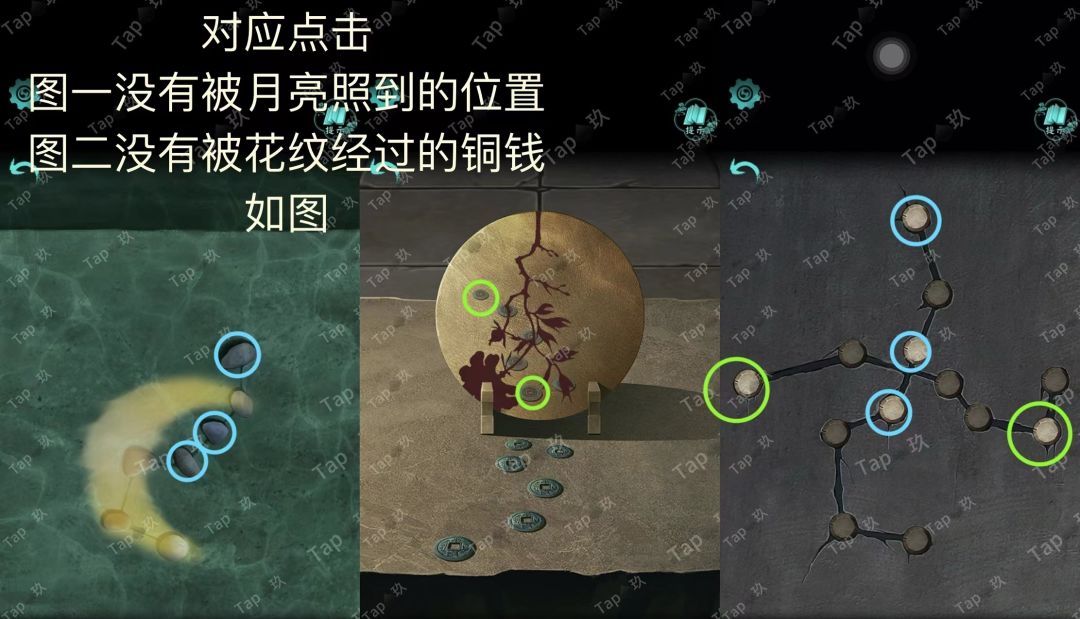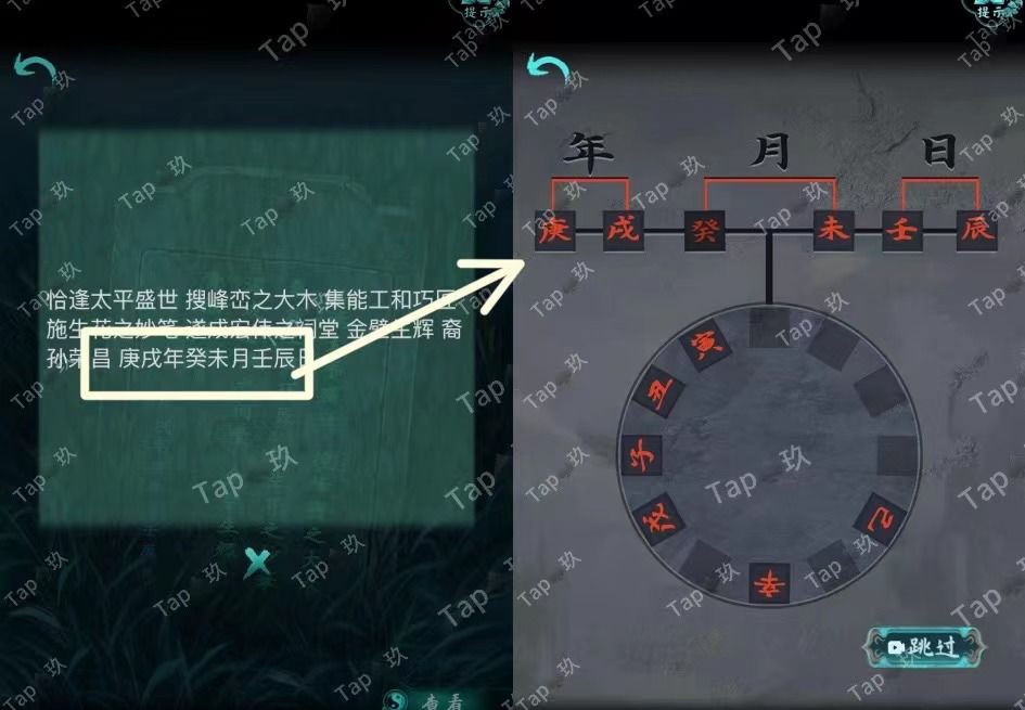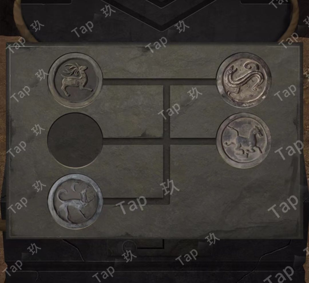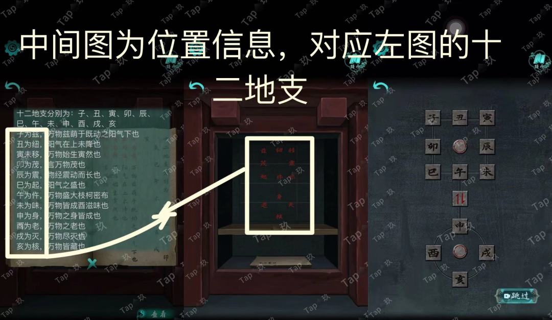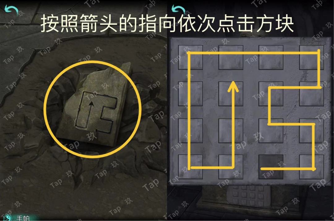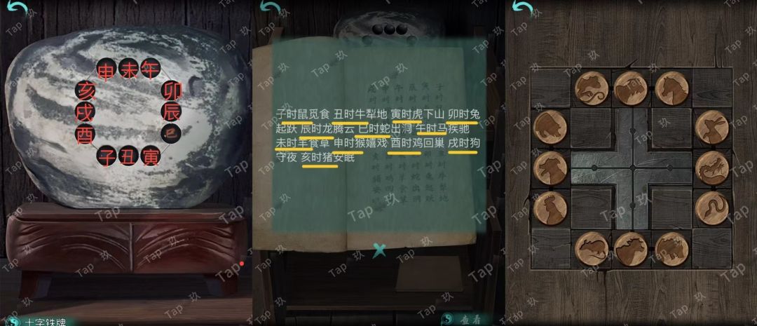 点击右侧石雕底座机关,结合线索点击如图,获得