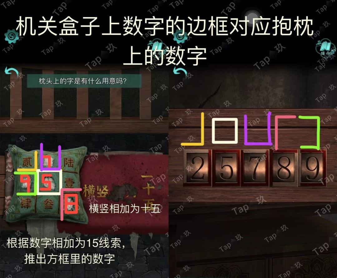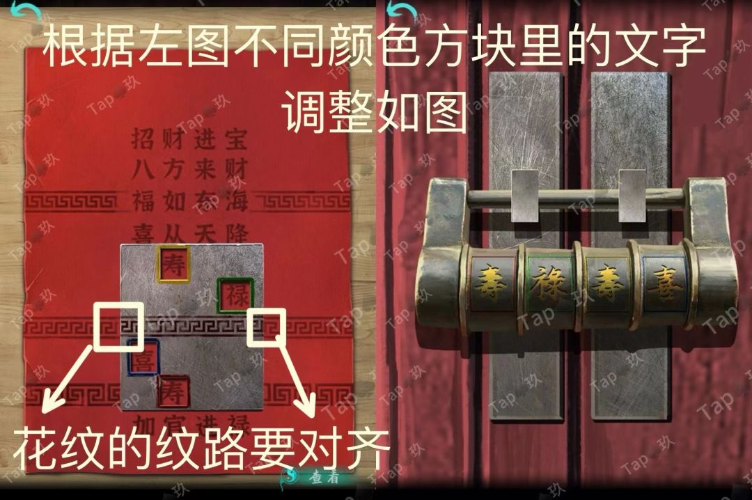 点击最左侧房间房间,点击门锁使用【星按钮】,结合鼓线索调整如图,进入