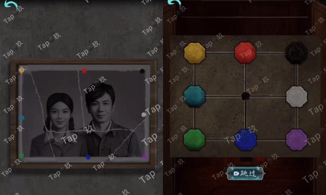 32-离开卧室,点击堂屋墙上的相框,放置【照片碎片×3】,获得颜色线索