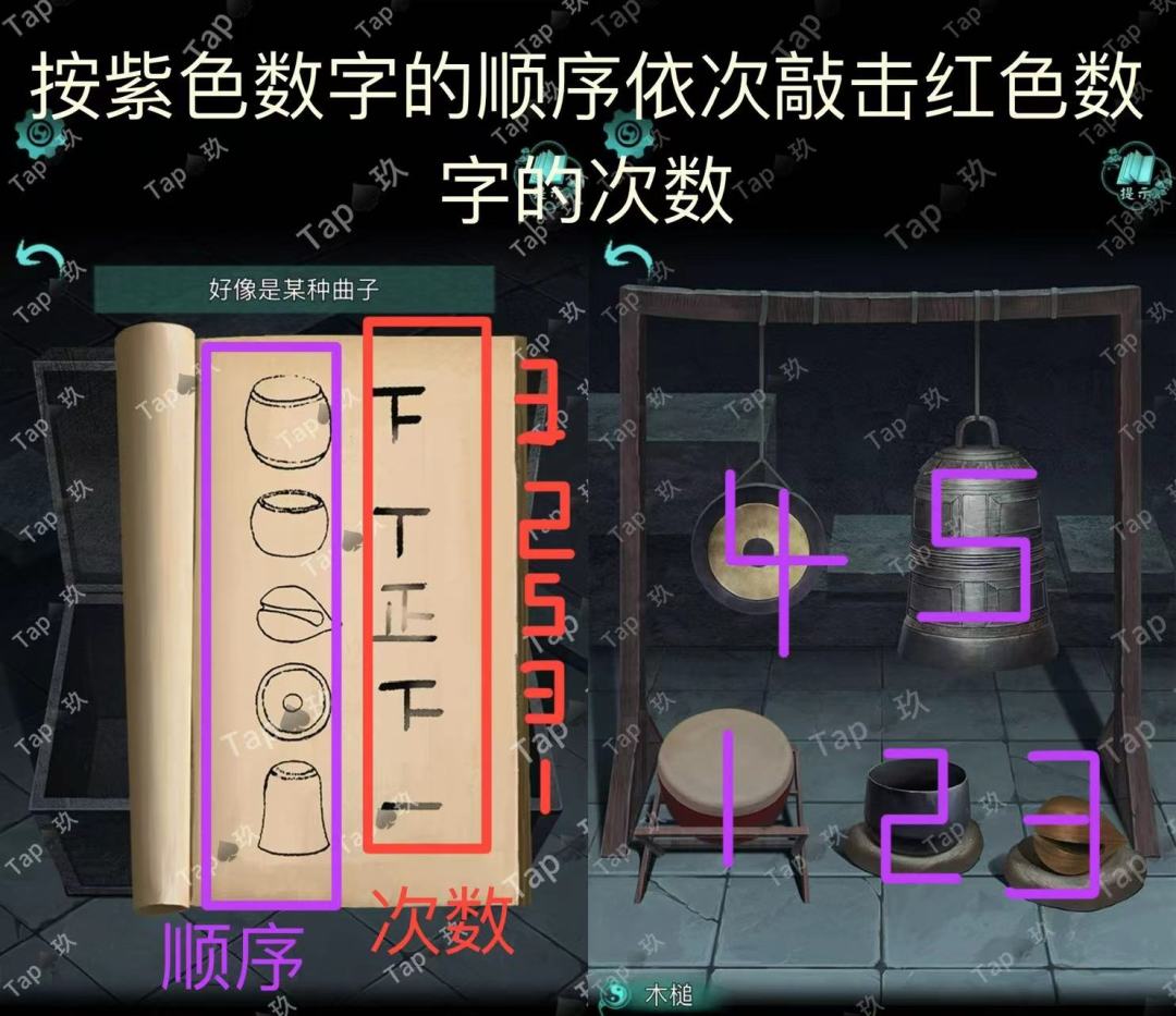 24-点击舞台上的乐器架放置【鼓】,结合「迎神曲」线索使用【木槌】敲击如图