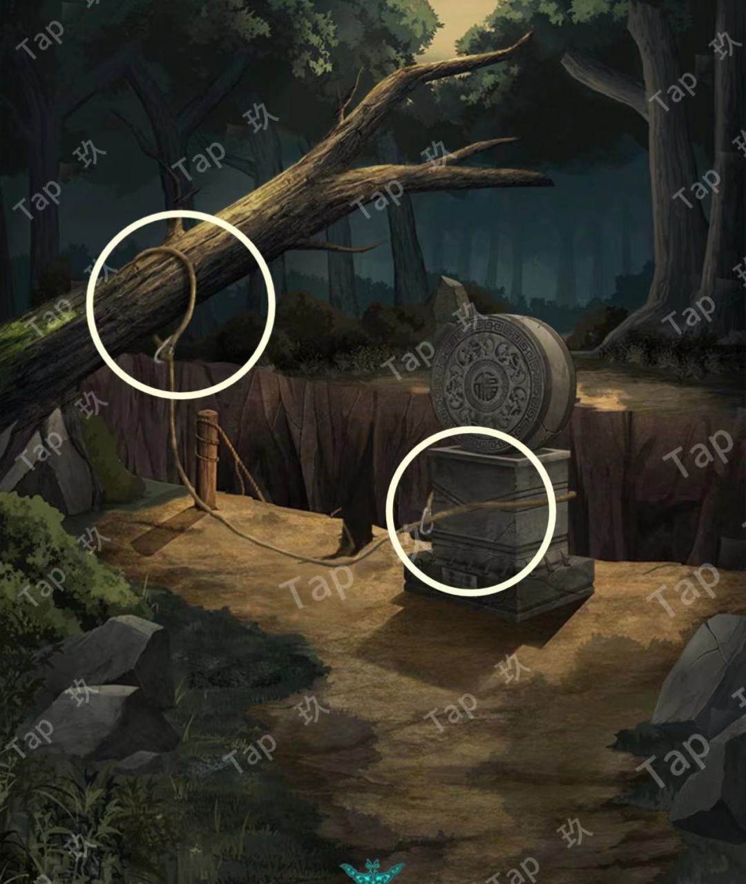 18-进入树林,点击大树使用【登山绳】,点击绳结绑在石碑上