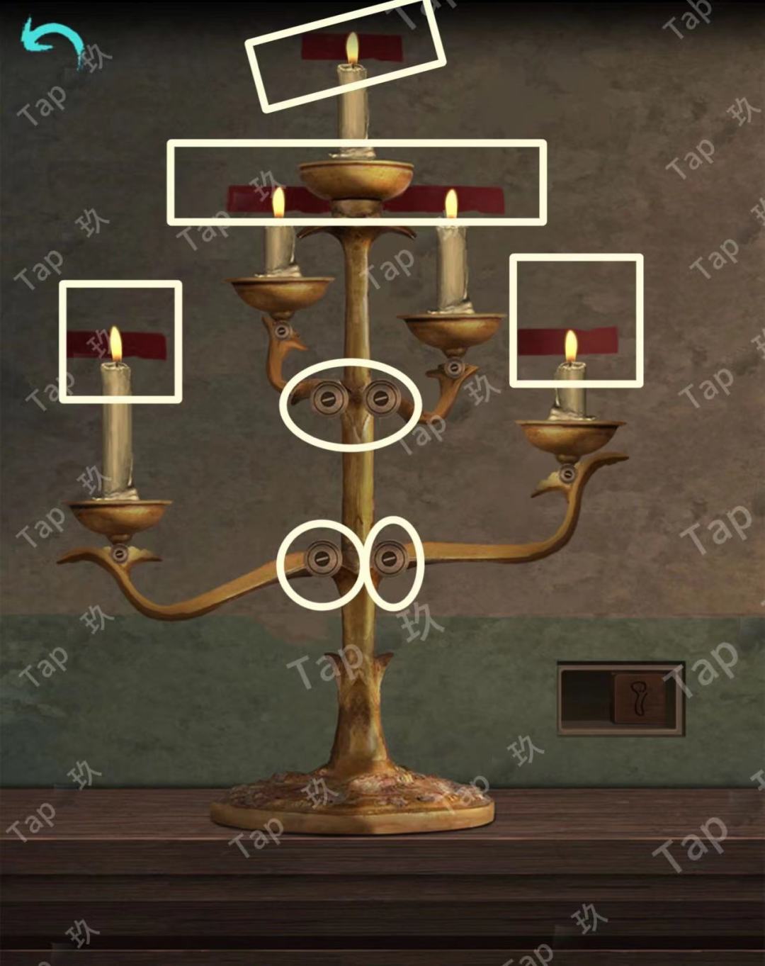 24-点击烛台使用【火柴】,点击烛台分支上的旋钮,使蜡烛的火焰在红线处,获得【滑块2】