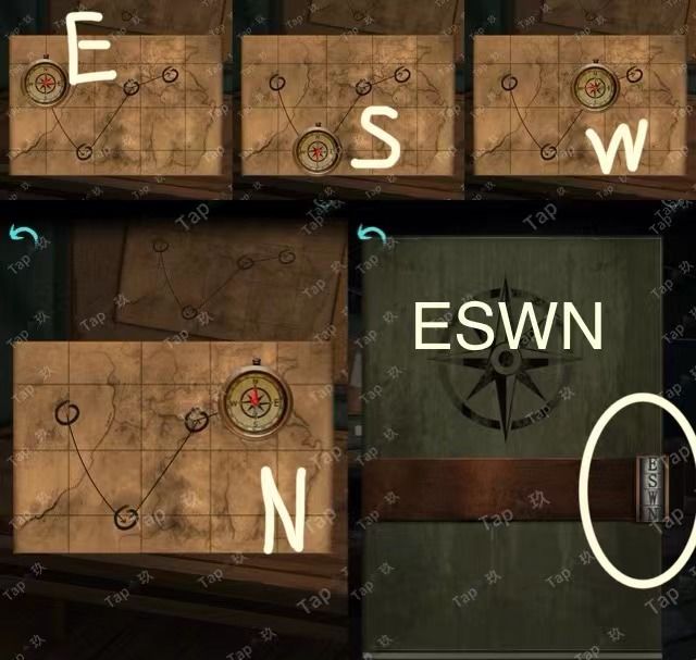 10-点击桌子墙壁上的地图,在圈起来的位置依次使用【指南针】获得字母线索