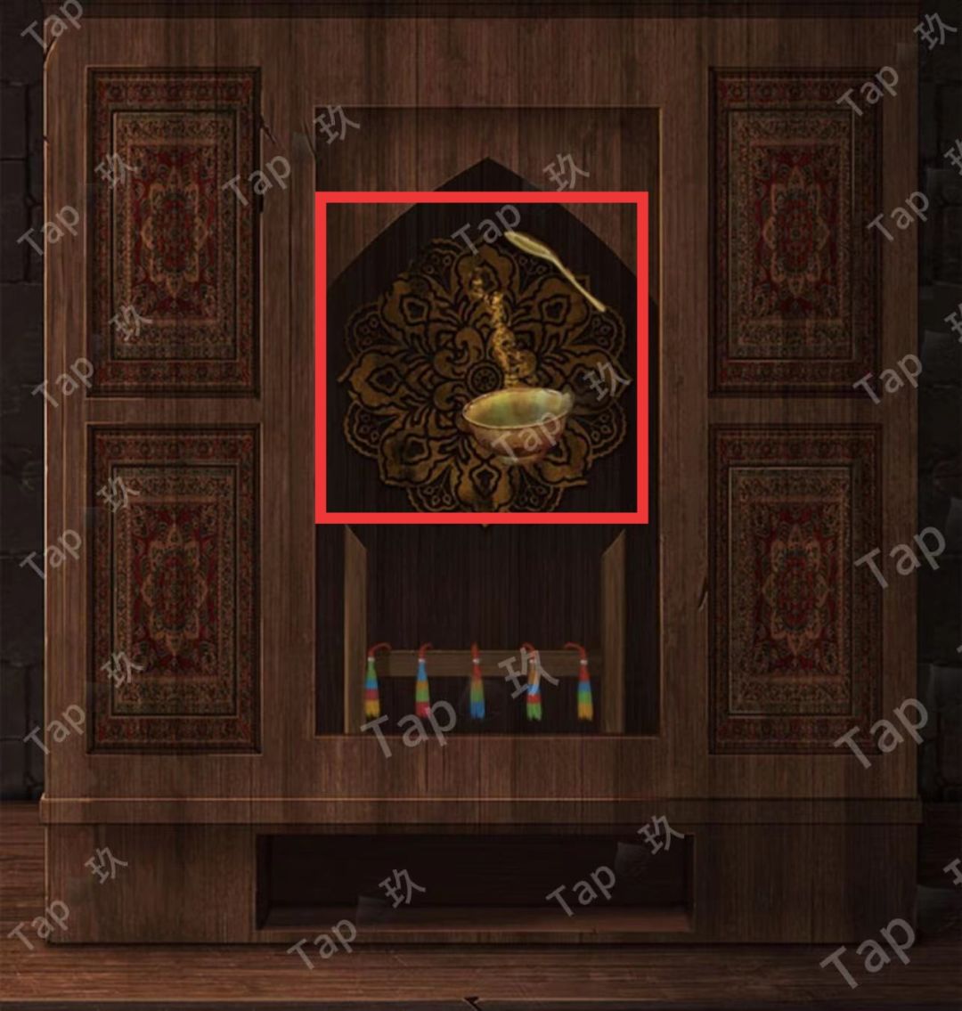点击下方柜子,结合书中线索调整如图,获得【鎏金碗勺子】