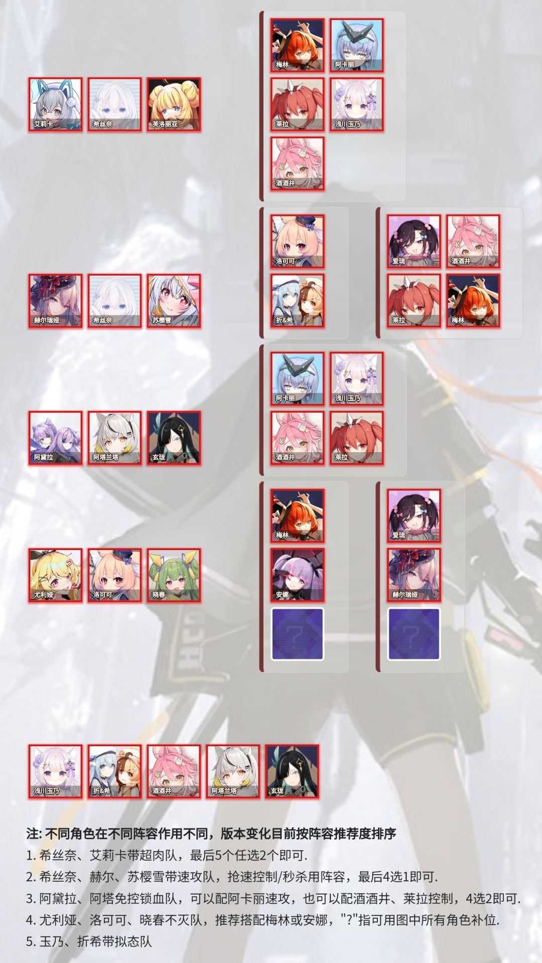 注意: 此为近期强力成型阵容整合得到的角色搭配图,首发阵容请见6月29日6月24日举例5月18日5月初举例4月3日更新加入近期新角色特殊3月3日更新2月13日更新这里补位角色...