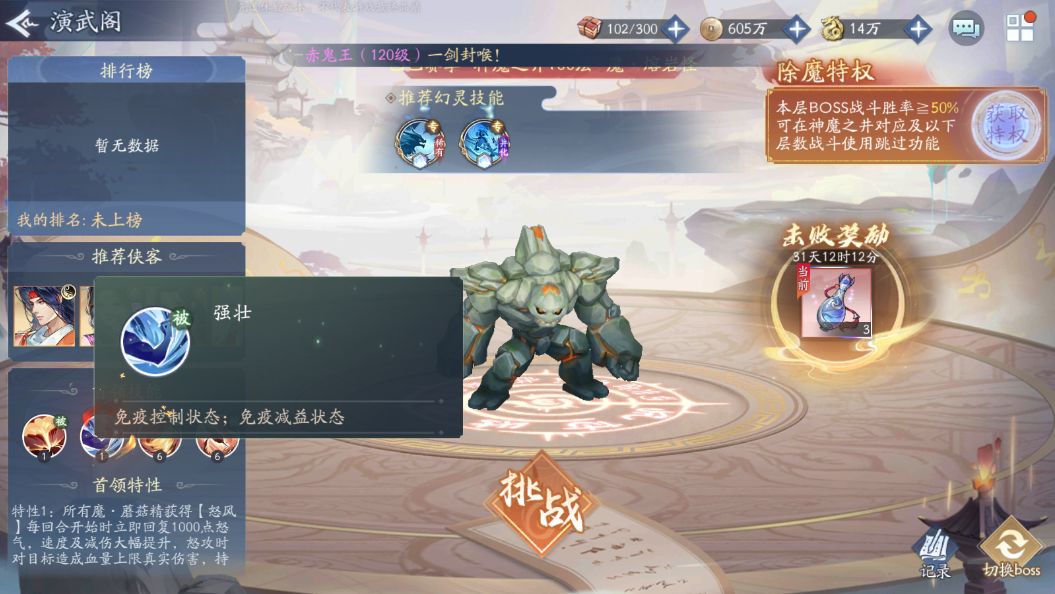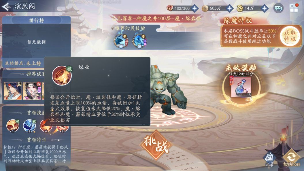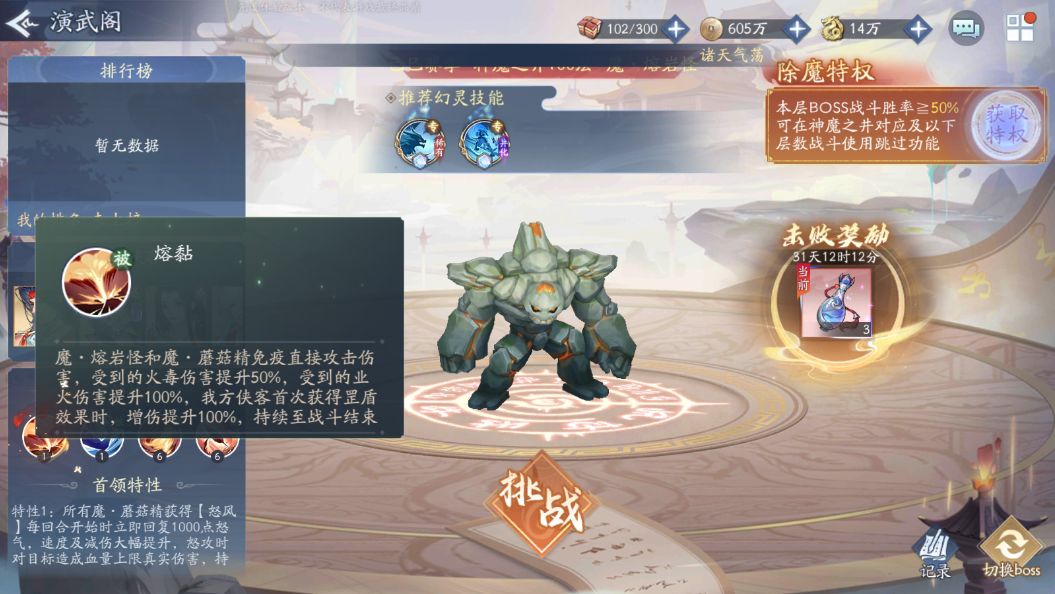 魔·熔岩怪和魔·蘑菇精免疫直接攻击伤害,受到的火毒伤害提升50%,受到的业火伤害提升100%,我方侠客首次获得罡盾效果时,增伤提升100%,持续至战斗结束
