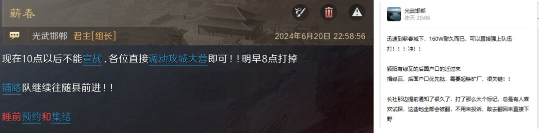 总结一下,同盟内需要以下组织结构:总指挥,负责统一协调;战场指挥,2-3个,负责指挥发邮件;若干分组组长,负责单个战场;城主,负责城池军团部队的进攻组织。其他人员设置大家则可以按照实际情况灵活调整。依据此处结构,需要构建以下群聊统一协调:同盟总群;总管理+指挥群;分组群;单独任务小群(按任务灵活调整)。管理时各司其职,由上到下执行到位即可。